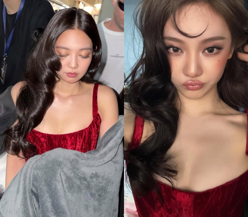 BLACKPINKのジェニーとaespaのニンニンが同じ赤のミニドレスを着用し、視線を集めている。