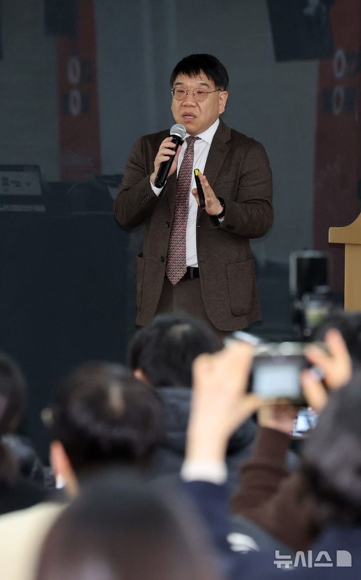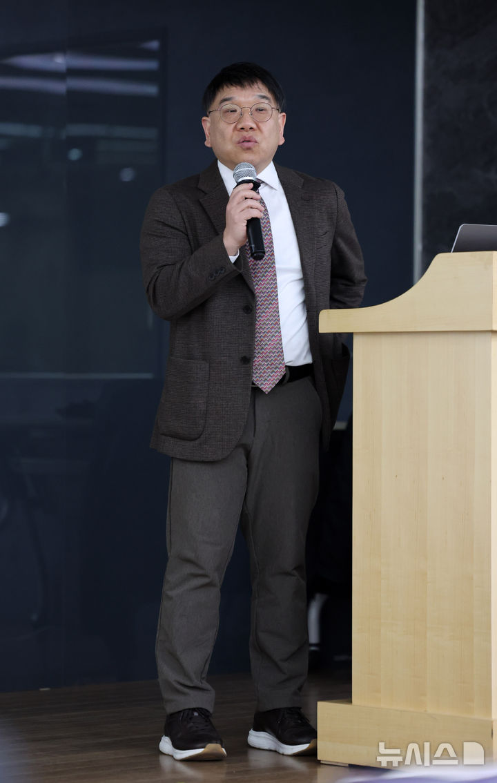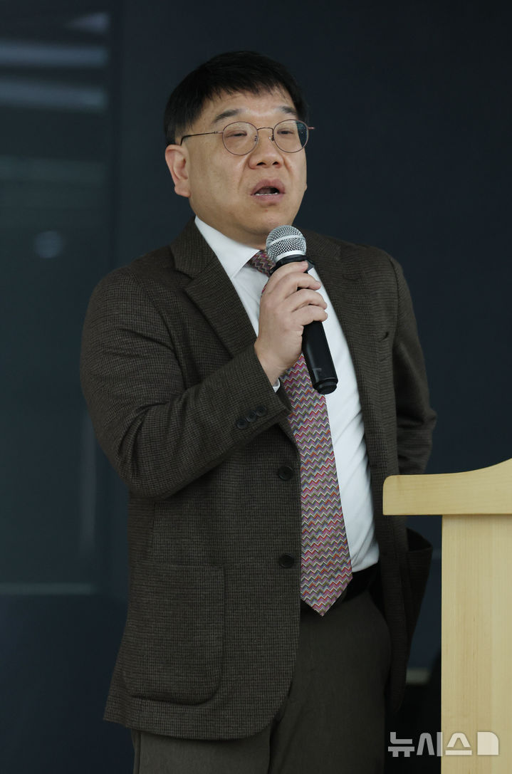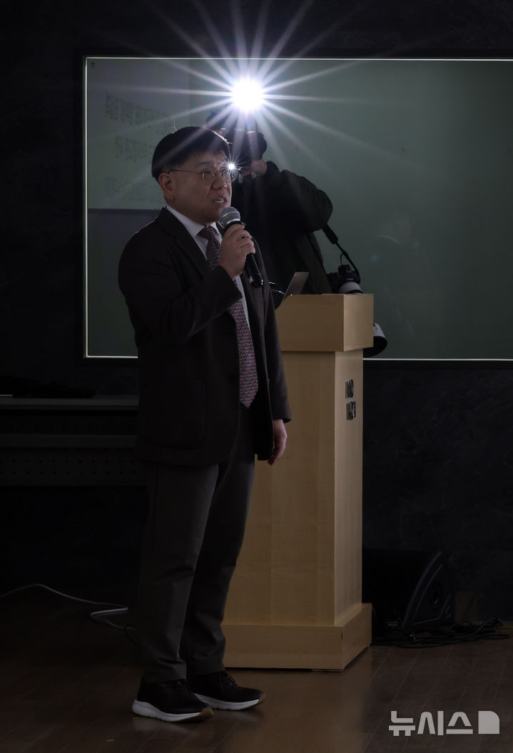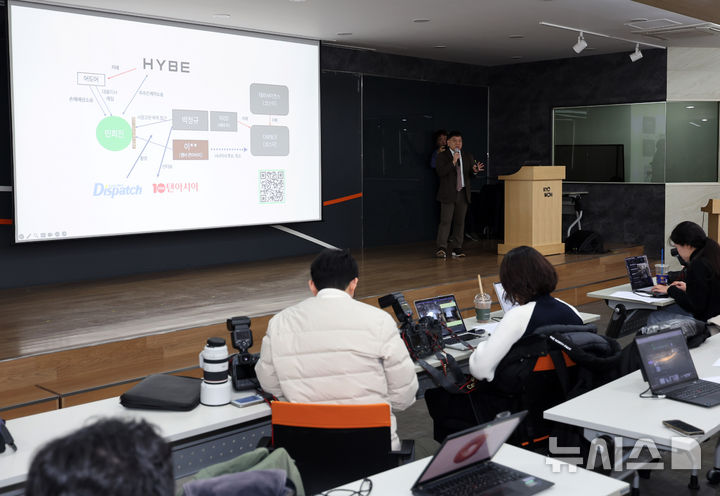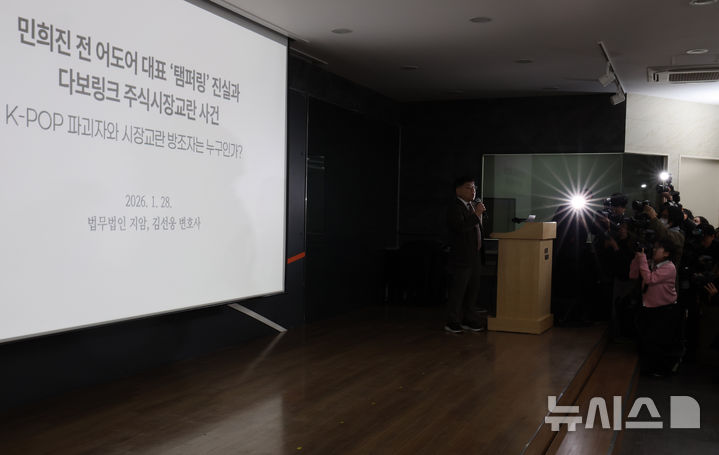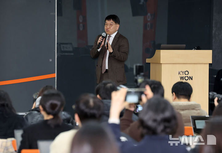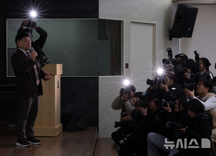 【NEWSIS】ミン・ヒジン前ADOR代表の法律代理人を務めるキム・ソンウン弁護士が28日午後、ソウル市鍾路区のキョウォン鐘閣ビルで開かれた記者会見で、アイドルグループNewJeansを巡る「引き抜き疑惑」について発言しているところ。