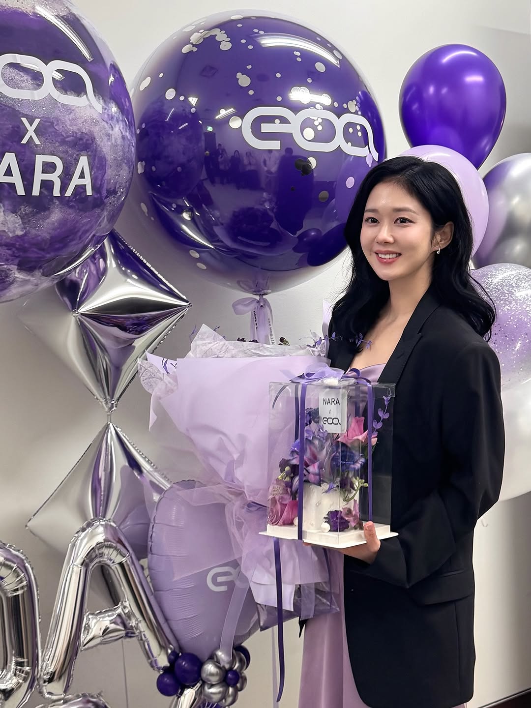 写真のチャン・ナラは、美容家電の広告撮影に臨んでいる。魅惑的な紫色のシルクドレスを着て黒いジャケットを羽織っているチャン・ナラは、同じく紫色の花束やケーキを持ってほほ笑みを浮かべている。はっきりした目鼻立ちと若々しい美しさが目を引く。