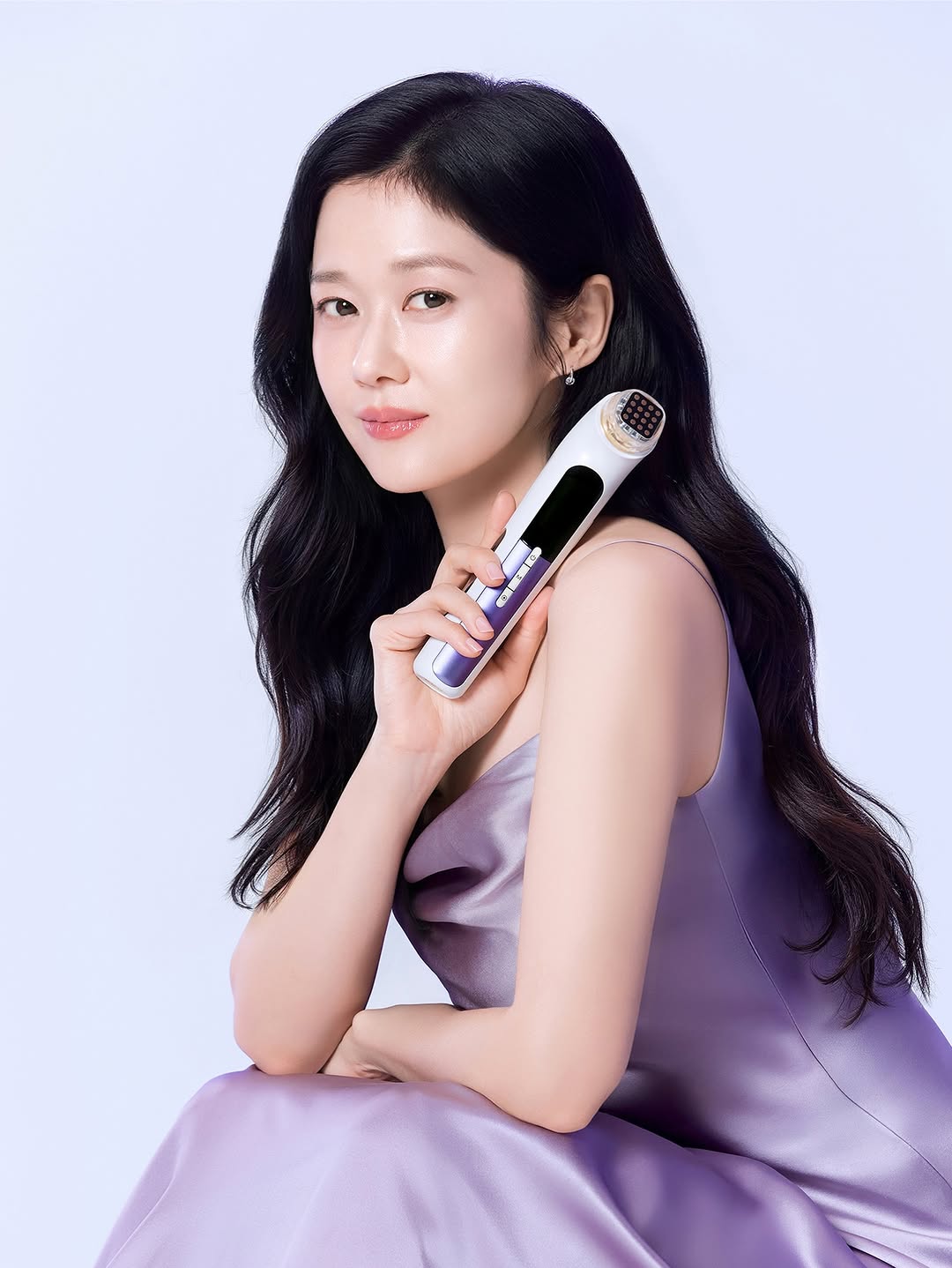 写真のチャン・ナラは、美容家電の広告撮影に臨んでいる。魅惑的な紫色のシルクドレスを着て黒いジャケットを羽織っているチャン・ナラは、同じく紫色..