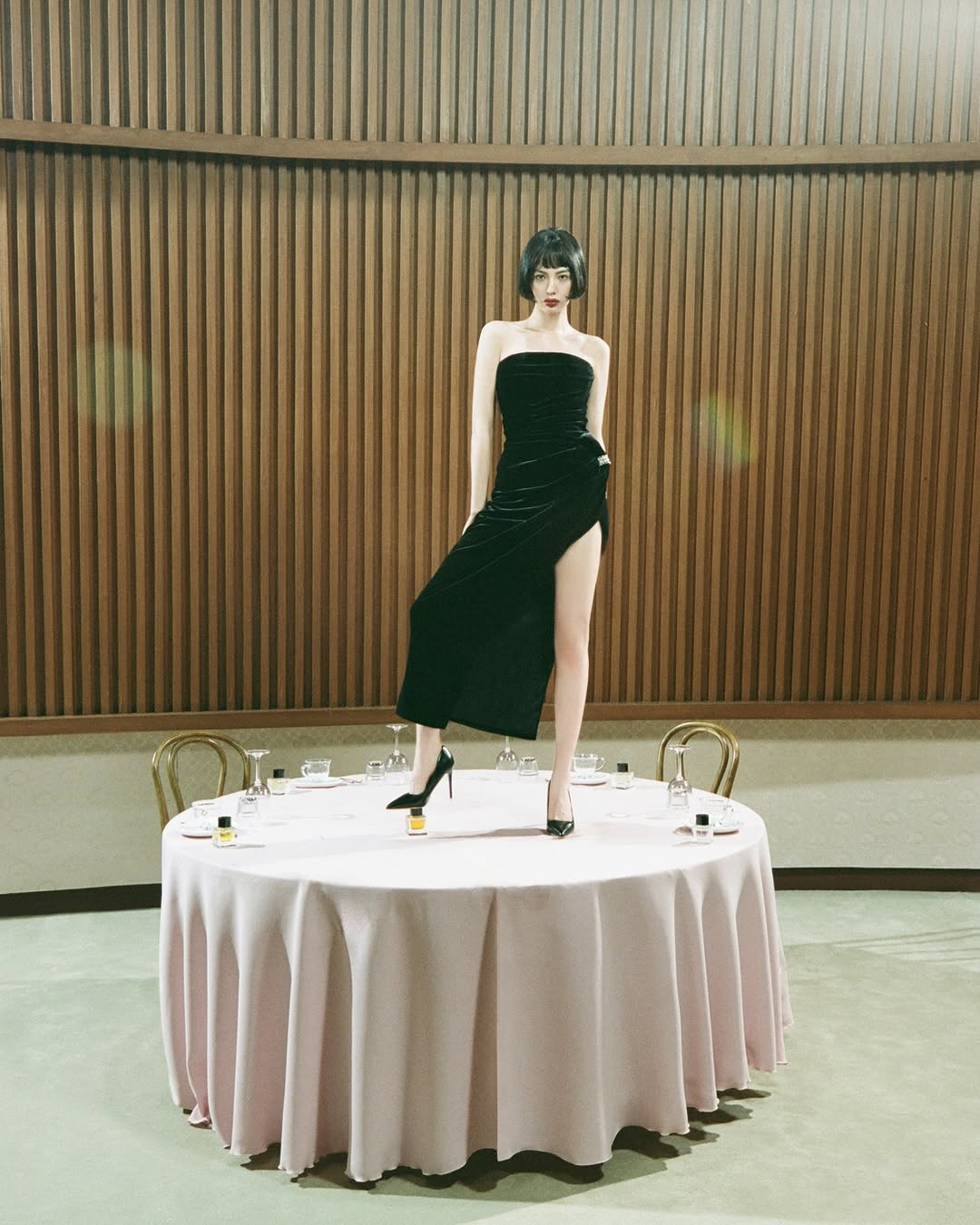 香水を活用してさまざまなポーズを取っているナナは、ショートヘアに赤い口紅、スリット入りの黒いドレス姿で優雅かつ魅惑的な雰囲気を振りまいた。