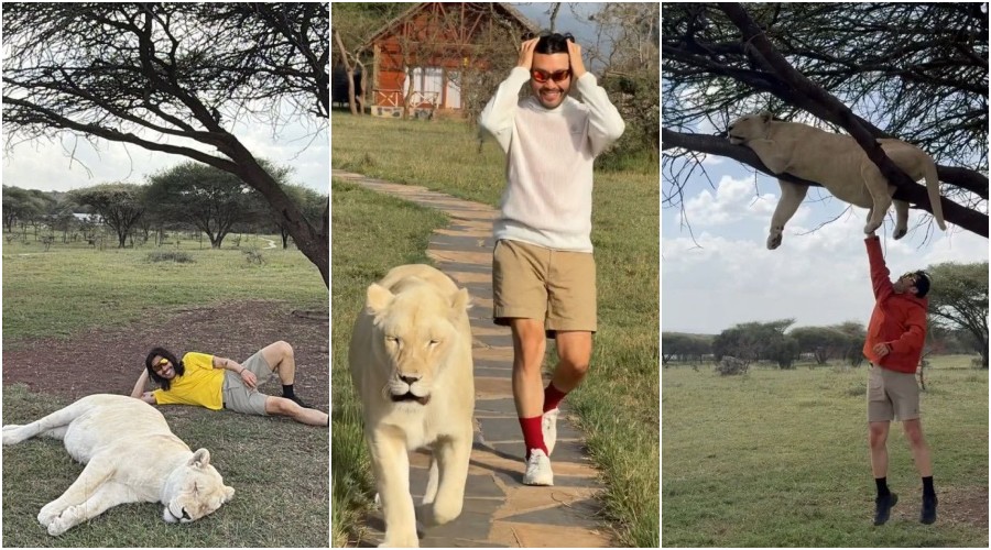 また別の写真では、草原に横たわっているライオンのそばに寝そべりながら余裕あふれるポーズを取っていたり、散策路をうろつくライオンの後を追い、特有のおどけたような表情を浮かべる動画もある。