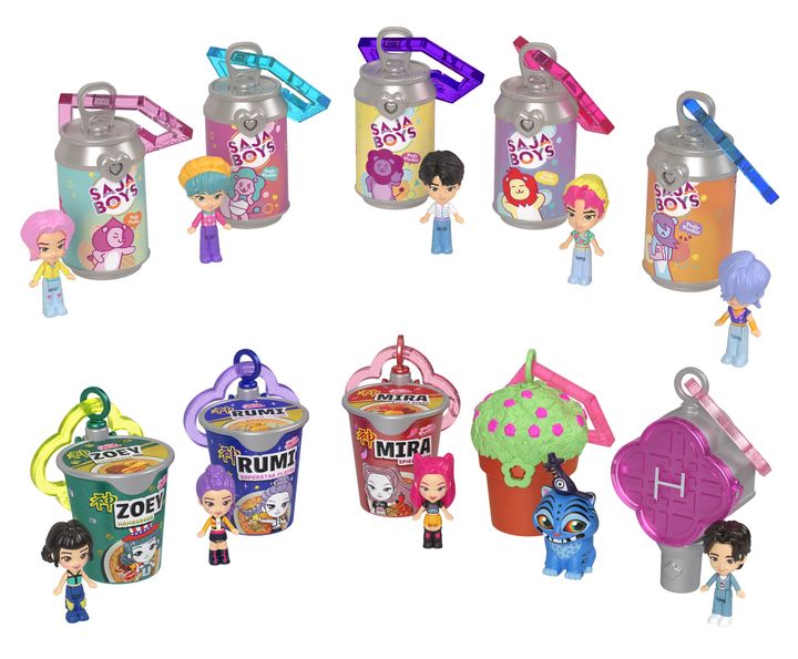 事前に公開された写真には、マテル社の「リトル・ピープル・コレクター」のハントリックスおよびサジャ・ボーイズ・バージョン、ハントリックスのカップラーメン・キーホルダー、サジャ・ボーイズの缶飲料キーホルダーなどが含まれている。/写真=マテル社のプレスリリースより