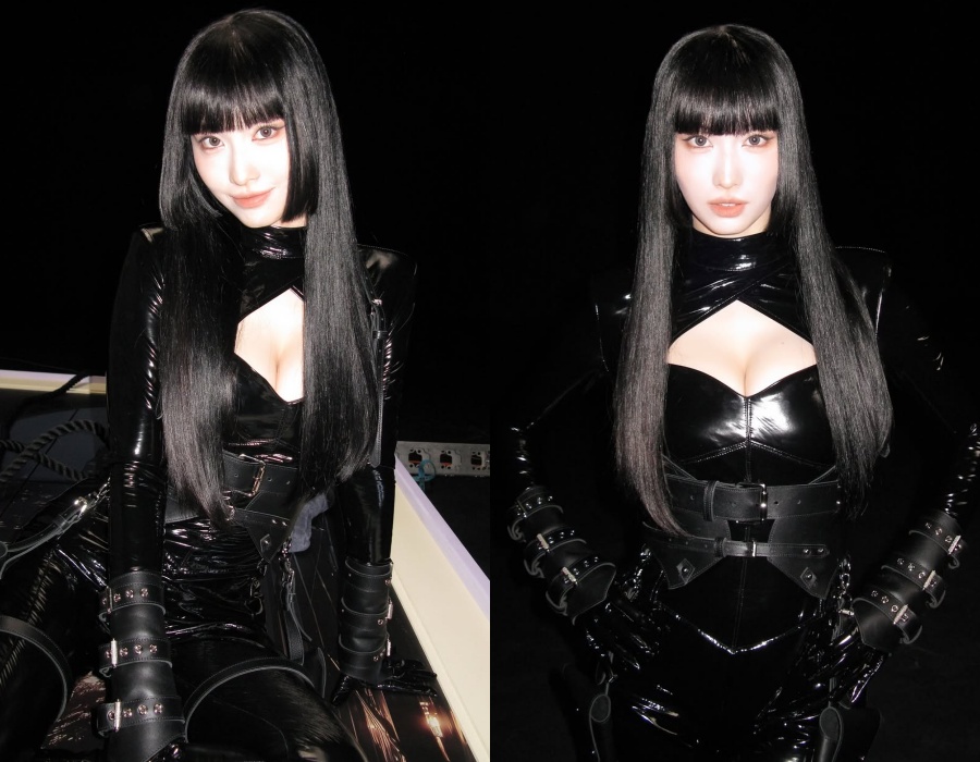 ボディにぴったり密着する黒レザーの衣装とベルト、ストラップのディテールが組み合わさり、カリスマあるシルエットが自然と形成されている。
