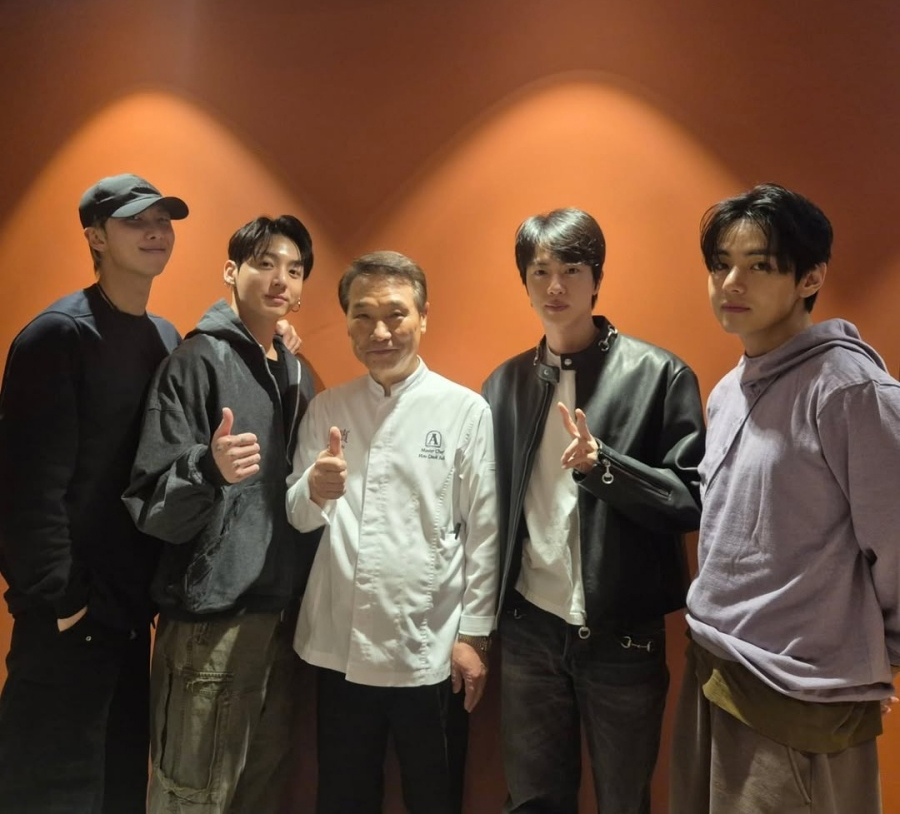 公開された写真では侯徳竹シェフを中心に、防弾少年団メンバーのRM、JUNG KOOK、JIN、Vが並び立ち、ほほ笑みを浮かべている。RMはJUNG KOOKの肩に手を載せ、格別な親交と愛情も露わにした。