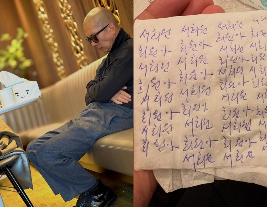 公開された写真には、楽屋のソファに座り、下を向いて深く考え込むク・ジュンヨプの姿が収められている。併せて公開された写真では、ティッシュにペンで「ソ・ヒウォン」「ヒウォン」という名前が隙間なくびっしり書いてあり、視線を引き付ける。ソ・ヒウォンは、ク・ジュンヨプの妻で台湾女優の故バービィー・スーさんの本名「徐熙媛」の韓国語読みだ。