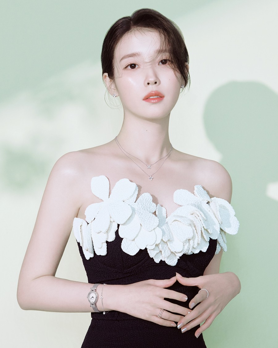 IUは、さわやかな淡いグリーンのドレスにきらめきながら揺れる花びらをイメージしたゴールドのネックレスや花びらの静かな動きを表現したピアスを合わせ、春の妖精を思わせる神秘的なビジュアルを完成させた。