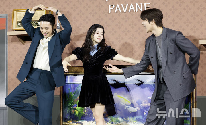 俳優ピョン・ヨハン、イ・ジョンピル監督、コ・アソン、ムン・サンミン(写真左から)が12日午前、ソウル市江南区の映画館「メガボックスCOEX」で開かれたNETFLIX映画『パヴァーヌ』の制作報告会でポーズを取っている様子。