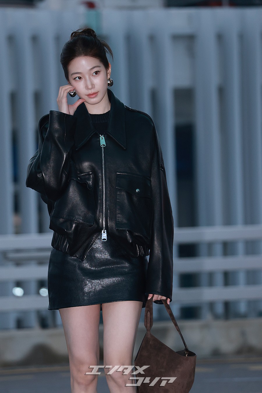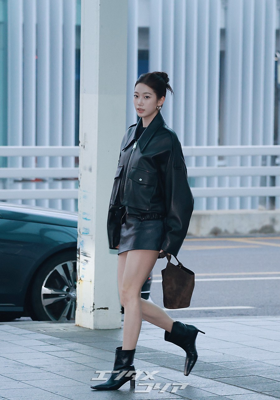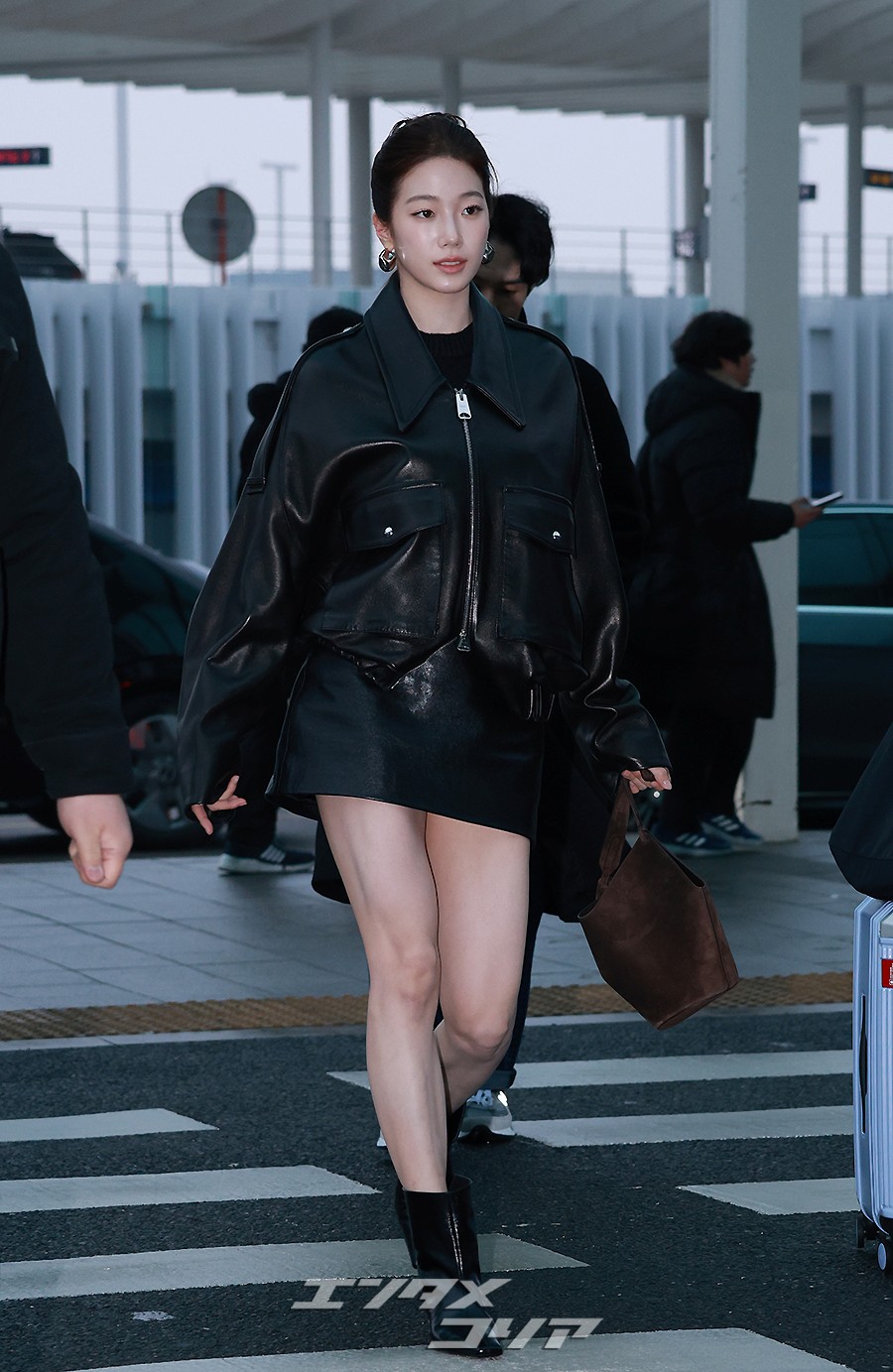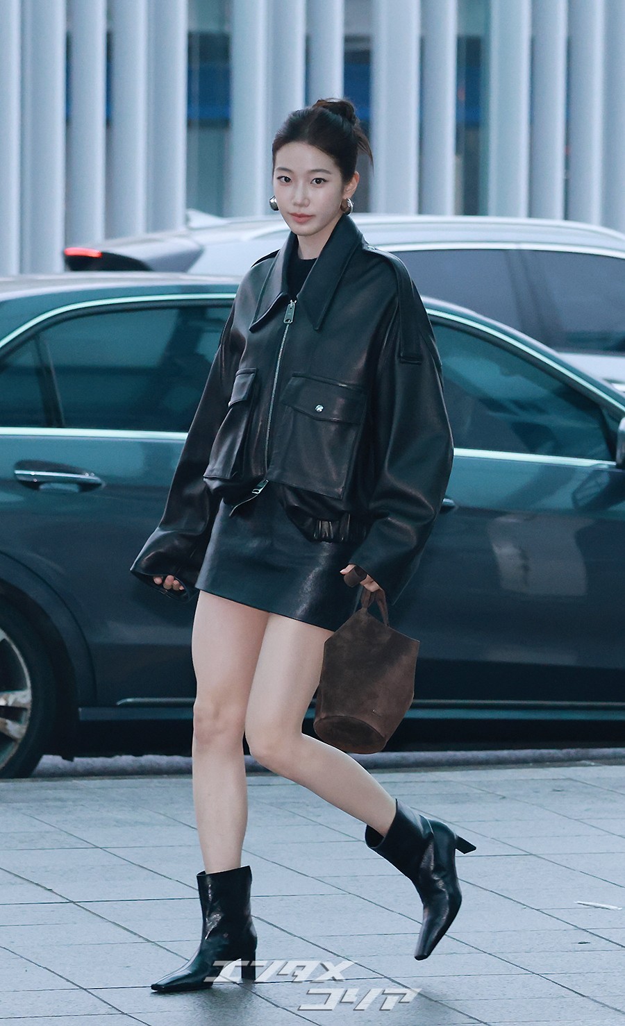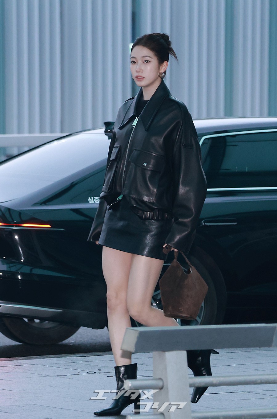 カズハは早朝にもかかわらず、完璧なコーディネートで現れた。光沢のある黒のレザーブルゾンに黒のミニスカート、ヘアスタイルはアップにして、シックな空港ファッションを披露した。