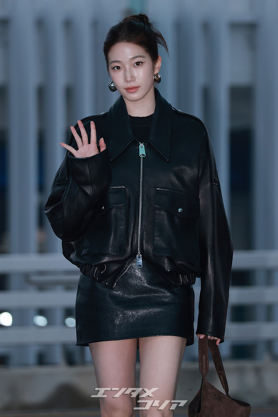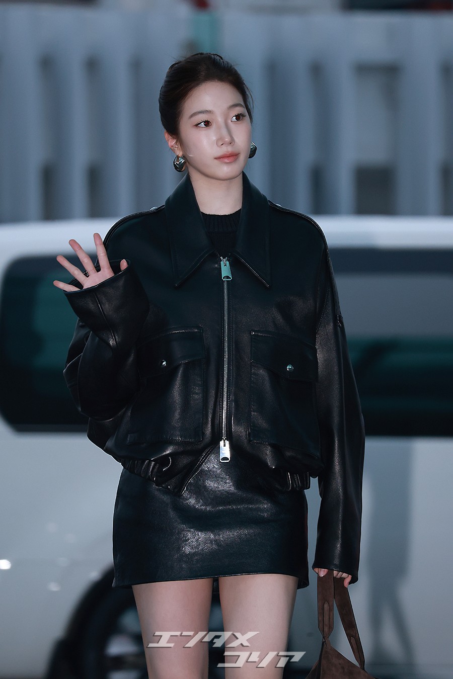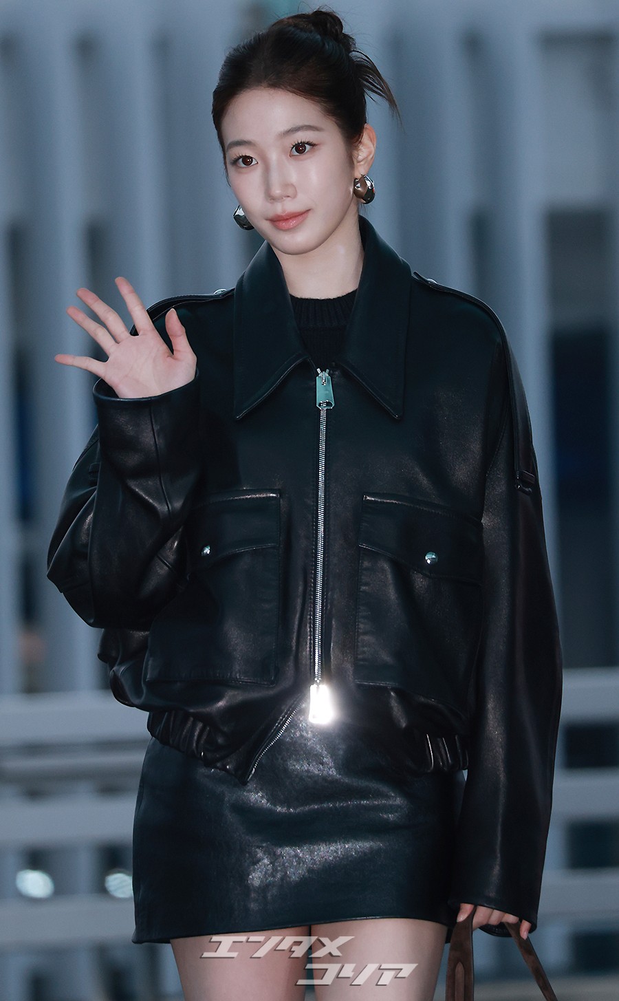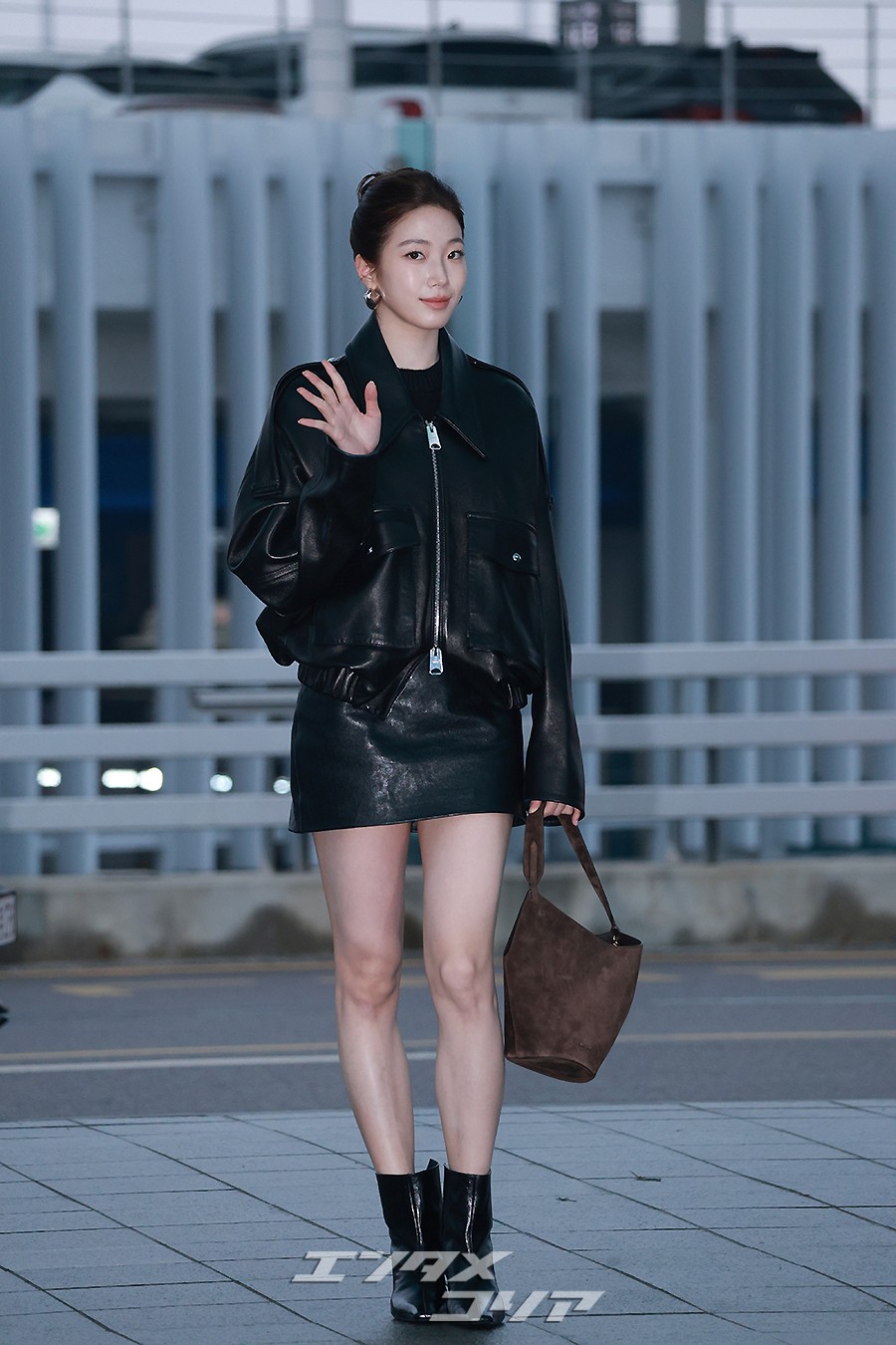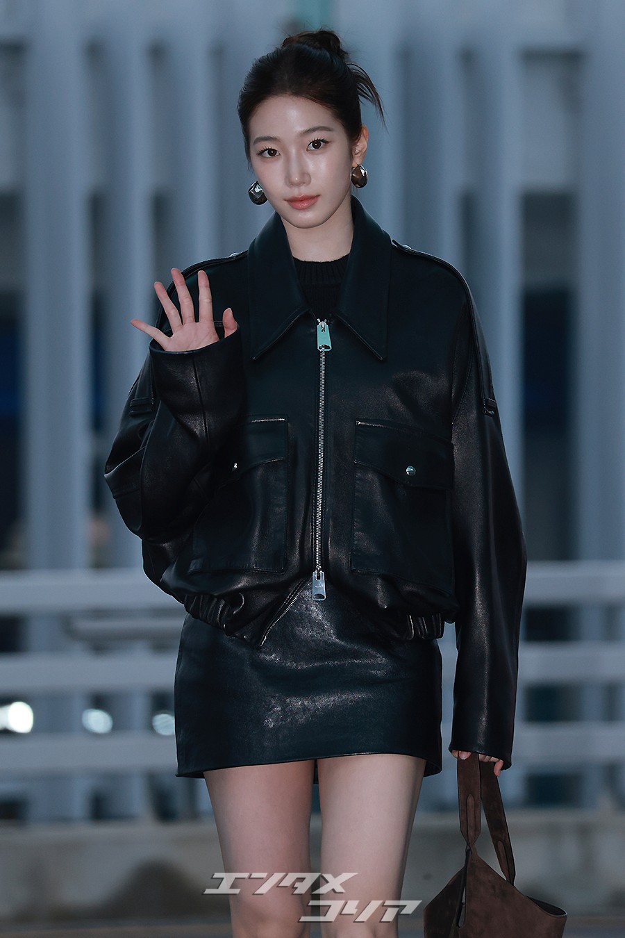 カズハは早朝にもかかわらず、完璧なコーディネートで現れた。光沢のある黒のレザーブルゾンに黒のミニスカート、ヘアスタイルはアップにして、シックな空港ファッションを披露した。