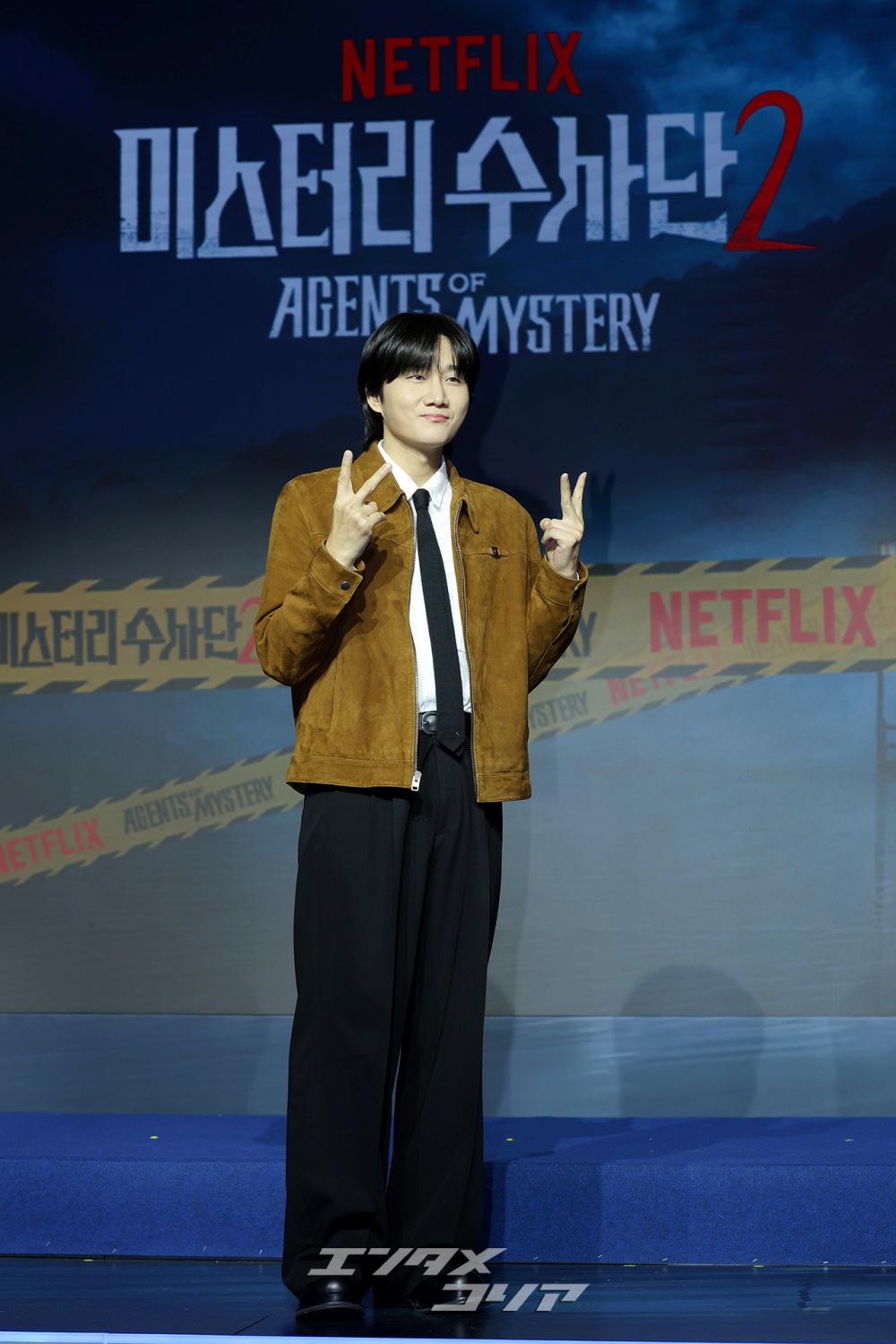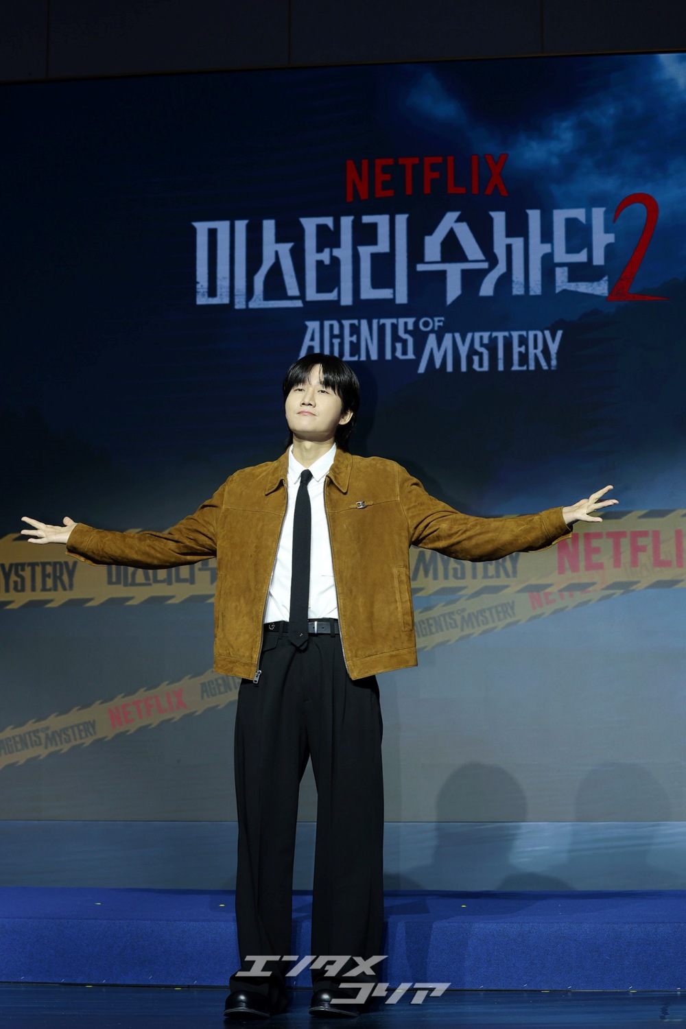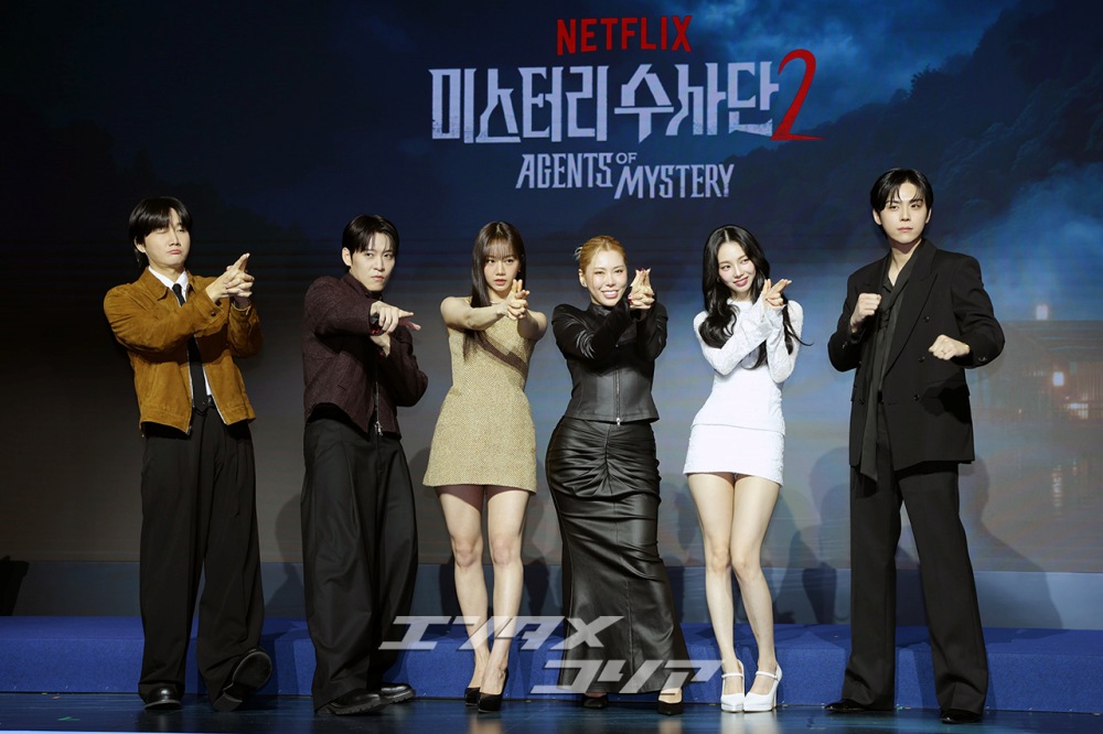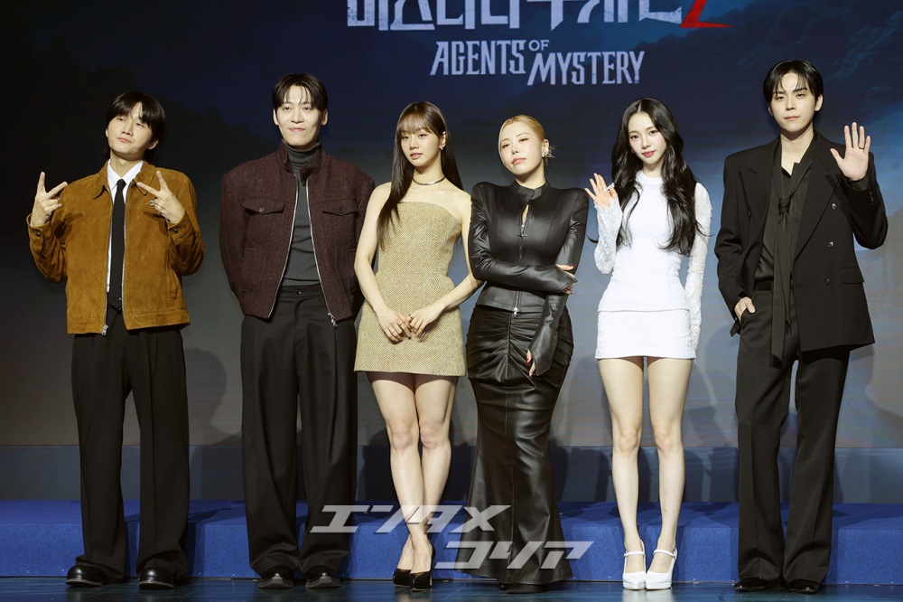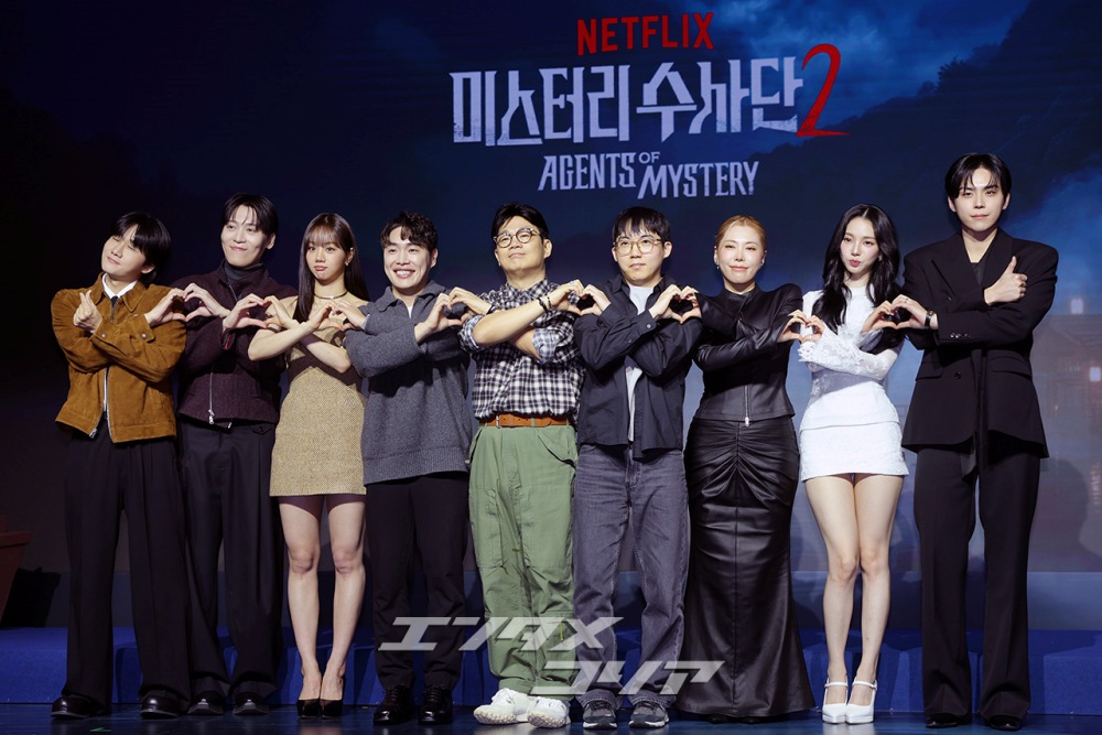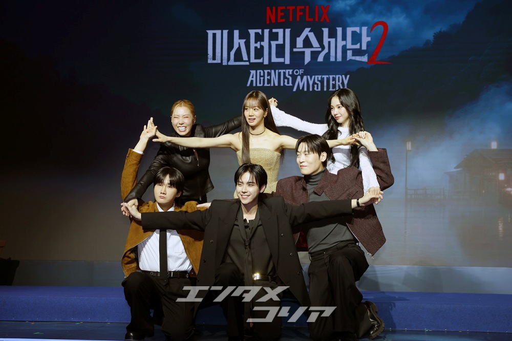 イ・ヨンジン(写真左から)、ジョン・パク、ヘリ、キム・ソグ・プロデューサー、チョン・ジョンヨン・プロデューサー、イ・ウォンギ・プロデューサー、Gabee、aespaのカリナ、キム・ドフンが19日、ソウル市麻浦区のホテル・ナル・ソウルMギャラリーで行われたNetflixのリアリティ番組『エージェント・オブ・ミステリー』シーズン2の制作発表会に出席した。