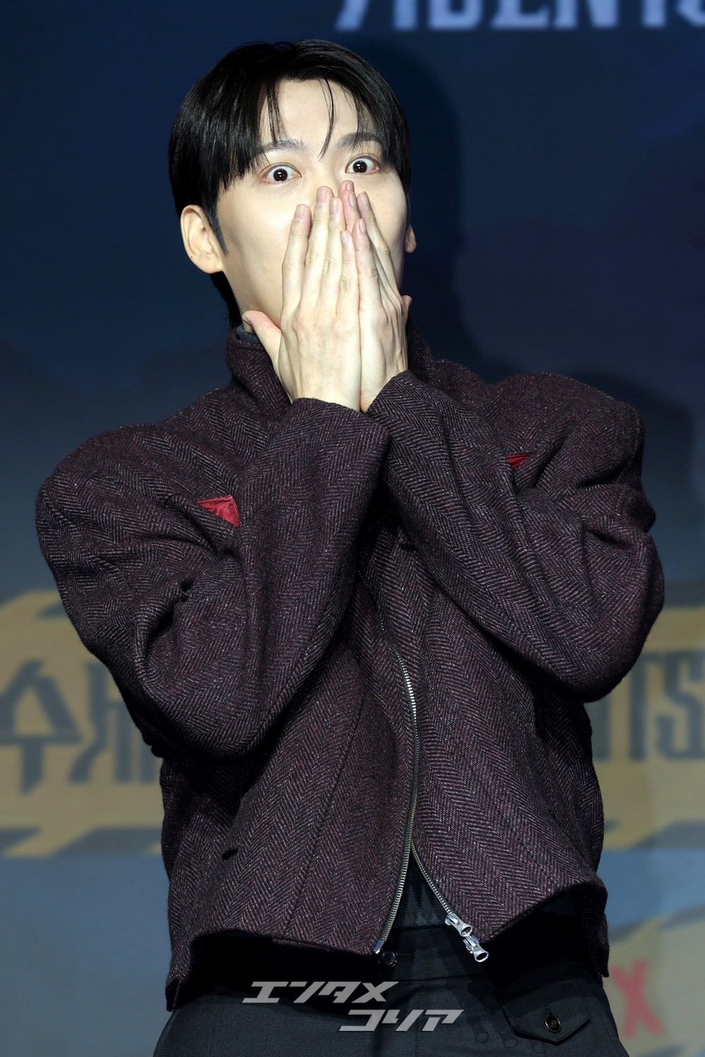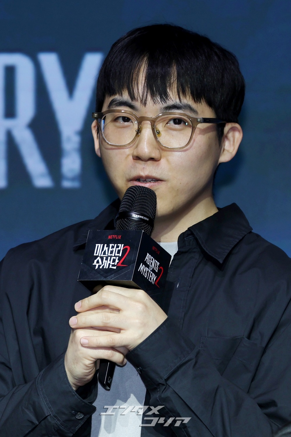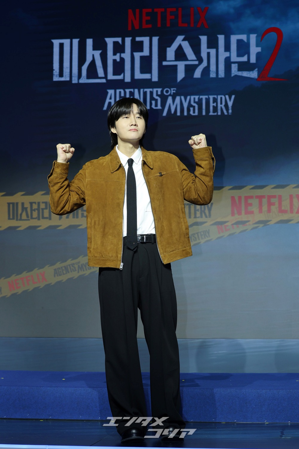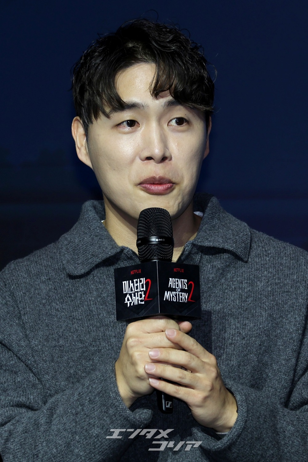 イ・ヨンジン(写真左から)、ジョン・パク、ヘリ、キム・ソグ・プロデューサー、チョン・ジョンヨン・プロデューサー、イ・ウォンギ・プロデューサー、Gabee、aespaのカリナ、キム・ドフンが19日、ソウル市麻浦区のホテル・ナル・ソウルMギャラリーで行われたNetflixのリアリティ番組『エージェント・オブ・ミステリー』シーズン2の制作発表会に出席した。