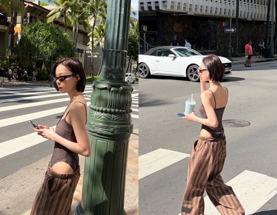 公開された写真を見ると、ウィンターはブラウンのスイムウエアにストライプ柄のパンツを合わせ、ナチュラルだが大胆なコーディネートを完成。細いストラップ、大きく開いた胸元が肩のラインやデコルテラインを強調しており、目を引く。