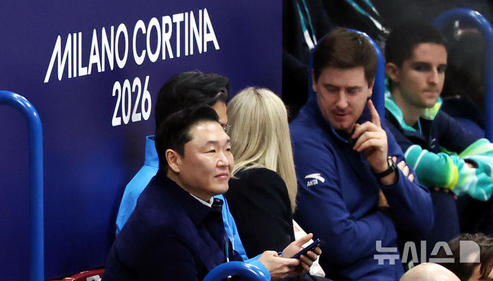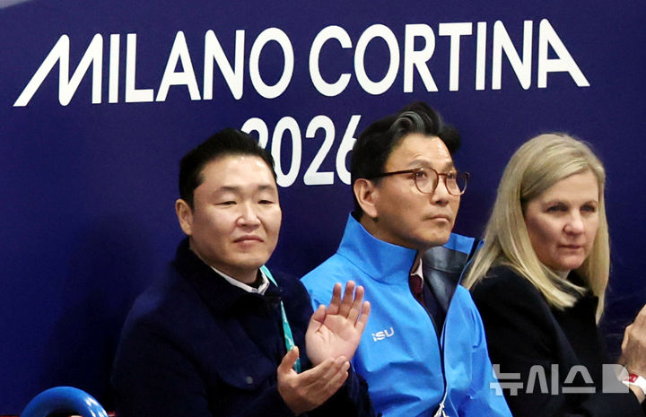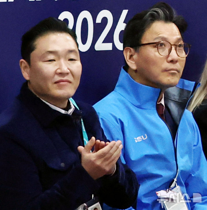 【NEWSIS】歌手PSY(サイ)=写真左=が19日(現地時間)、イタリアのミラノ・アイススケートアリーナ行われた2026年ミラノ・コルティナ冬季五輪フィギュアスケート女子シングル・フリーを観戦した。写真右は金載烈(キム・ジェヨル)国際スケート連盟(ISU)会長兼国際オリンピック委員会(IOC)理事。