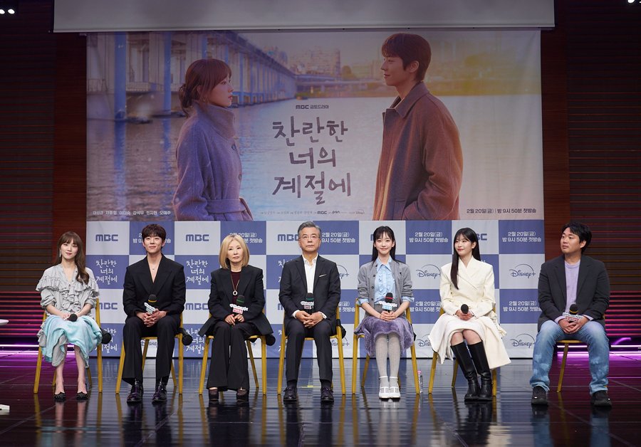 19日午後、ソウル市麻浦区のMBC新社屋で、新金土ドラマ『君がきらめく季節に』(チョ・ソンヒ脚本、チョン・サンヒ、キム・ヨンジェ演出)の制作発表会が行われた。写真はフォトタイムに応じる出演者のチェ・ジョンヒョプ、イ・ソンギョン、カン・ソグ、チョン・サンヒ演出、イ・ミスク、オ・イェジュ、ハン・ジヒョン。