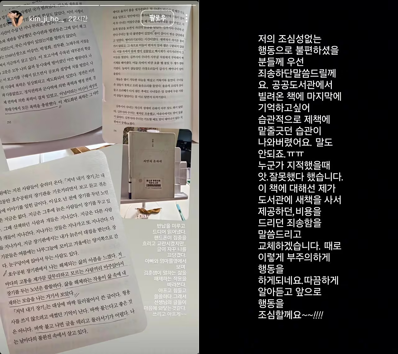 キム・ジホは23日、写真共有ソーシャル・ネットワーキング・サービス(SNS)「インスタグラム」を通して、「わたしの注意を欠いた行動で不快に感じられた方々にお詫びを申し上げます」「公共図書館で借りてきた本の最後の部分を覚えておきたくて、私物の本に下線を引いていた習慣が出てし..