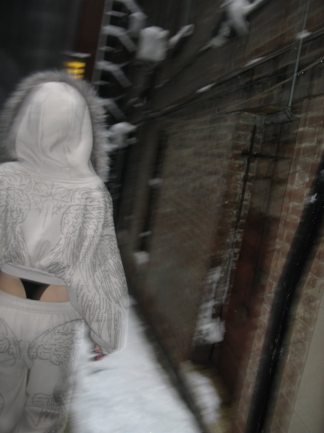 公開された写真を見ると、モモは脇腹が丸見えになっている黒いモノキニの上にショート丈のジップアップパーカーを着て、ポーズを取っている。雪降る米国ニューヨークの街で大胆な露出コーデを披露しているモモの姿が目を引く。