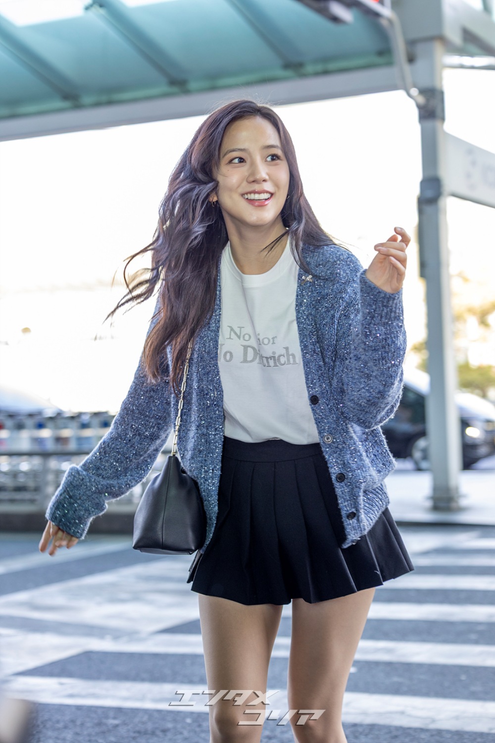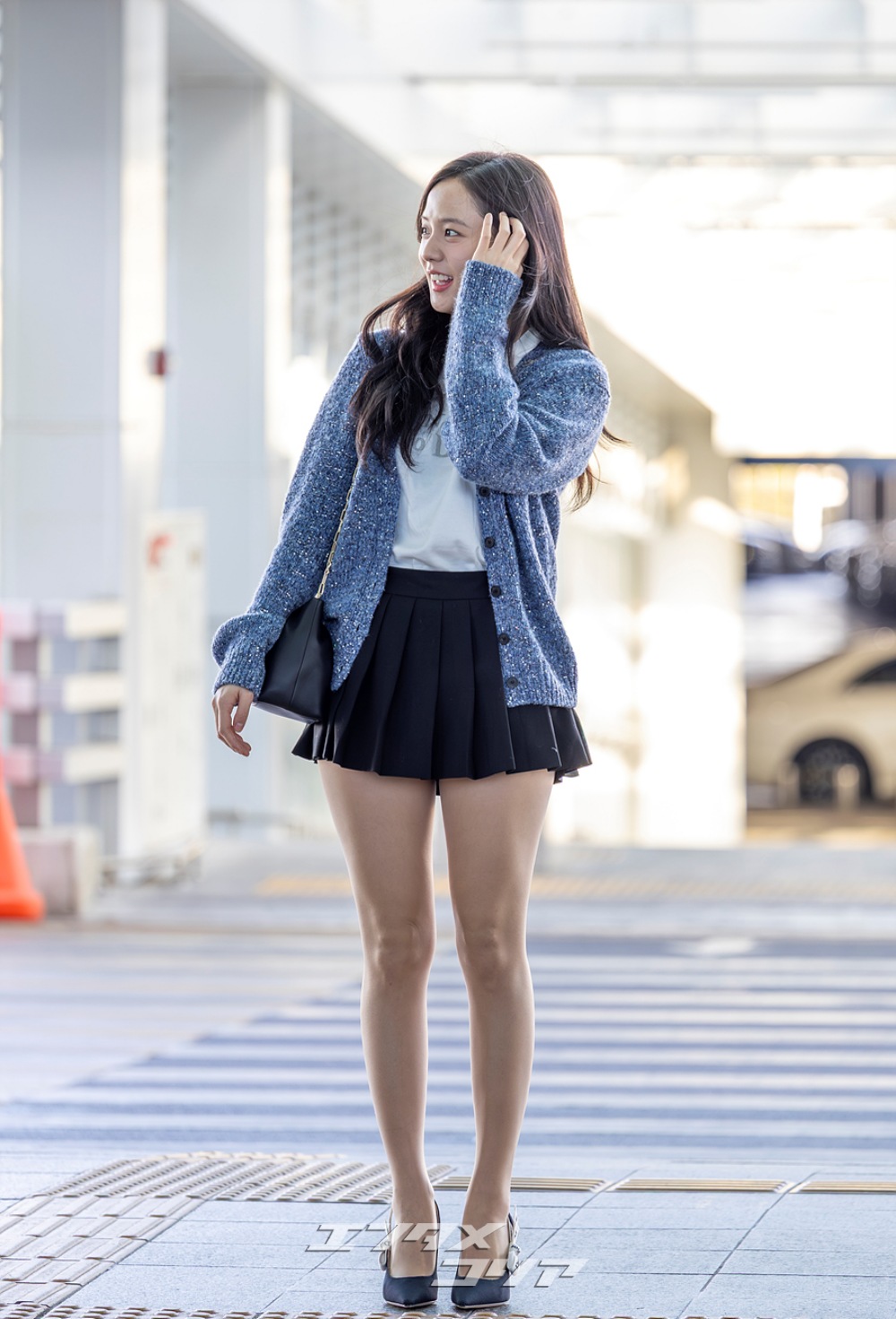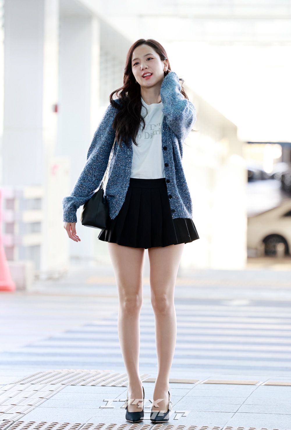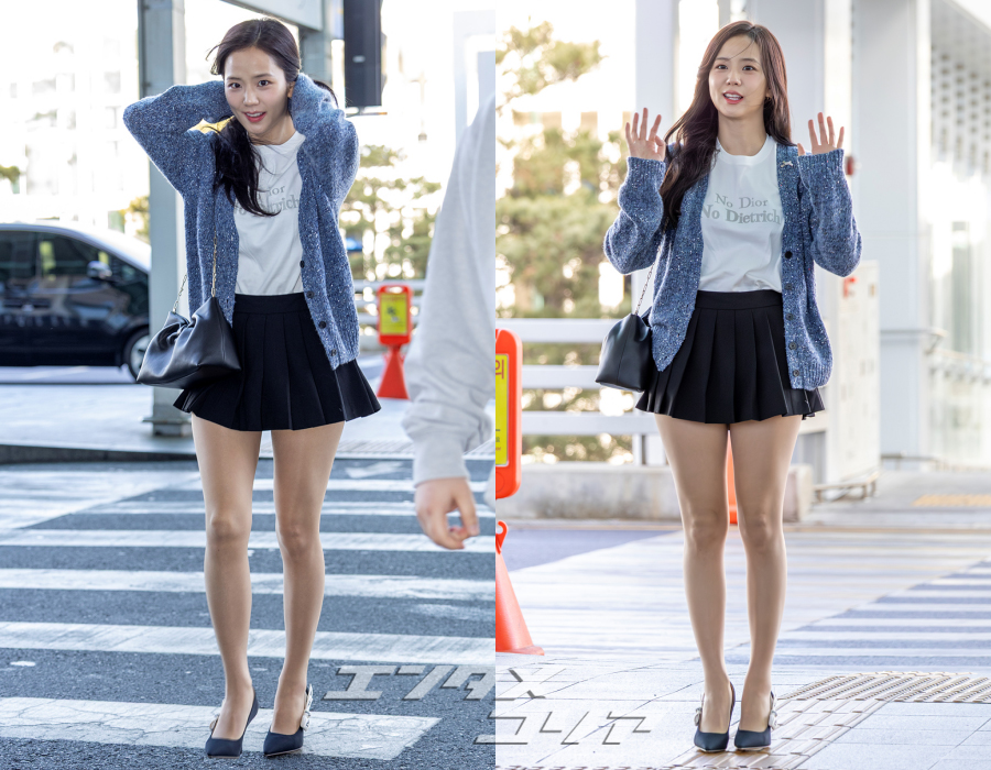 この日のジスはメランジ・ブルーのカーディガンに黒のミニプリーツスカートを合わせ、清楚な印象と共に美脚が際立つ空港ファッションを披露した。