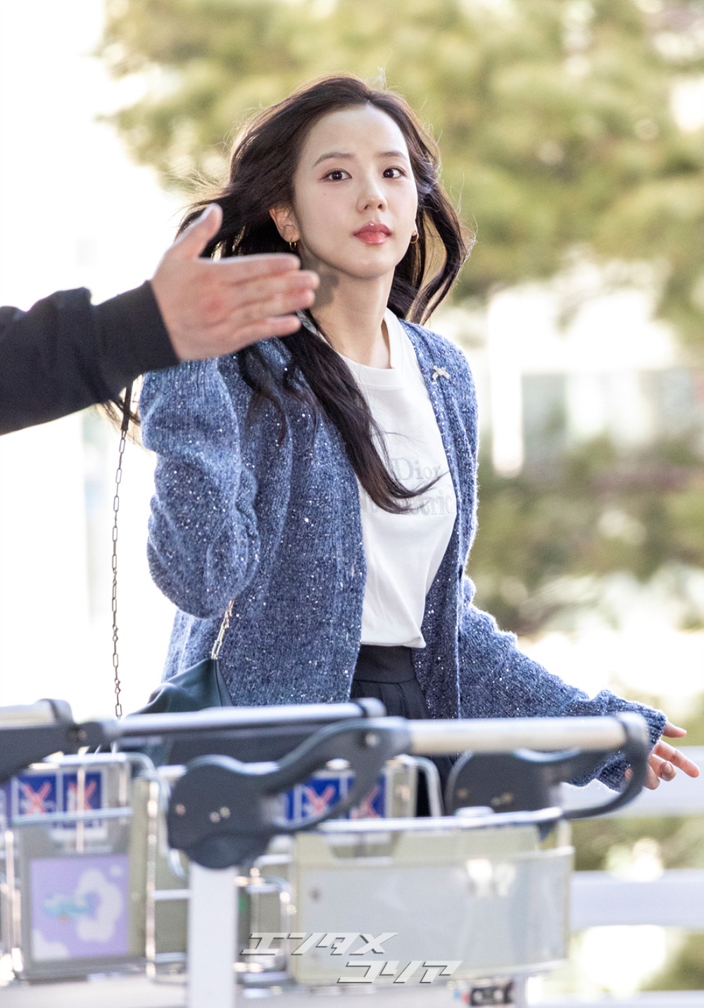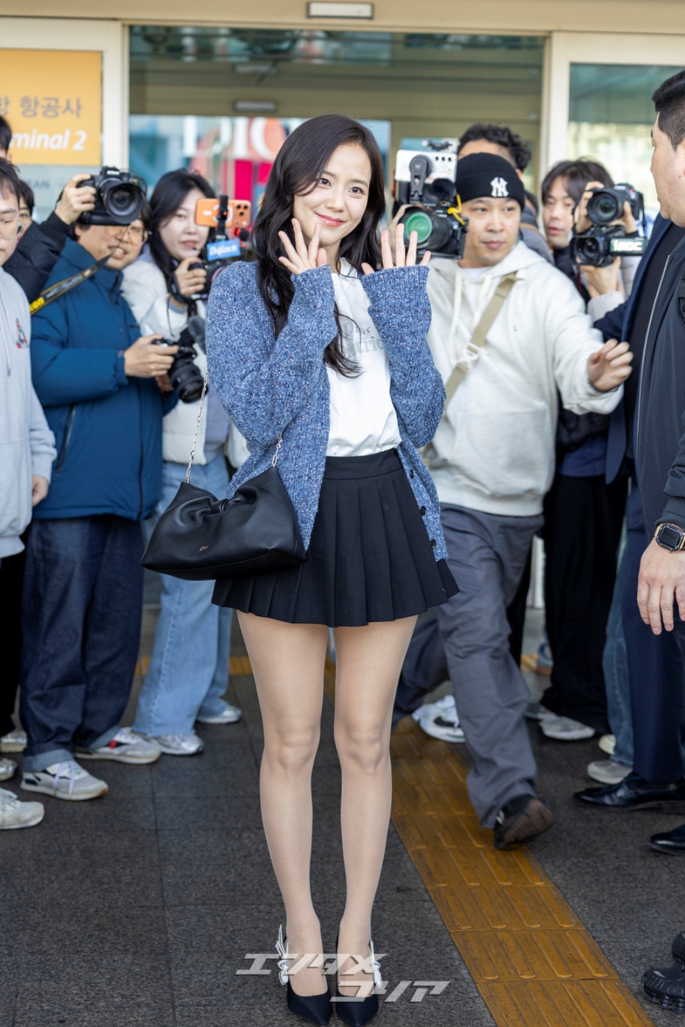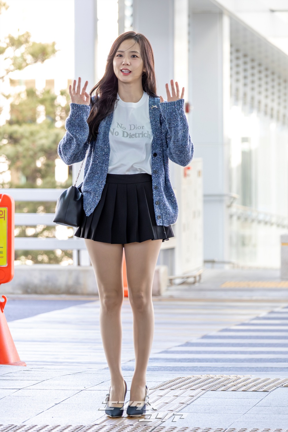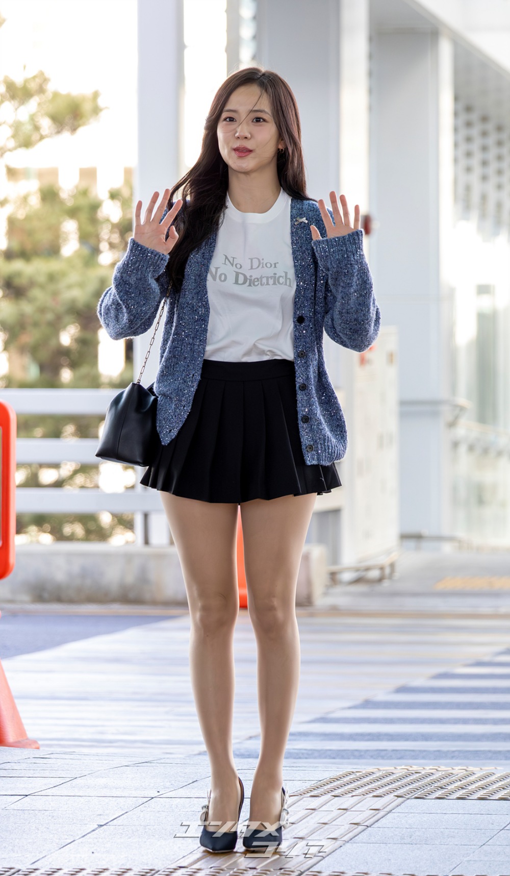 この日のジスはメランジ・ブルーのカーディガンに黒のミニプリーツスカートを合わせ、清楚な印象と共に美脚が際立つ空港ファッションを披露した。