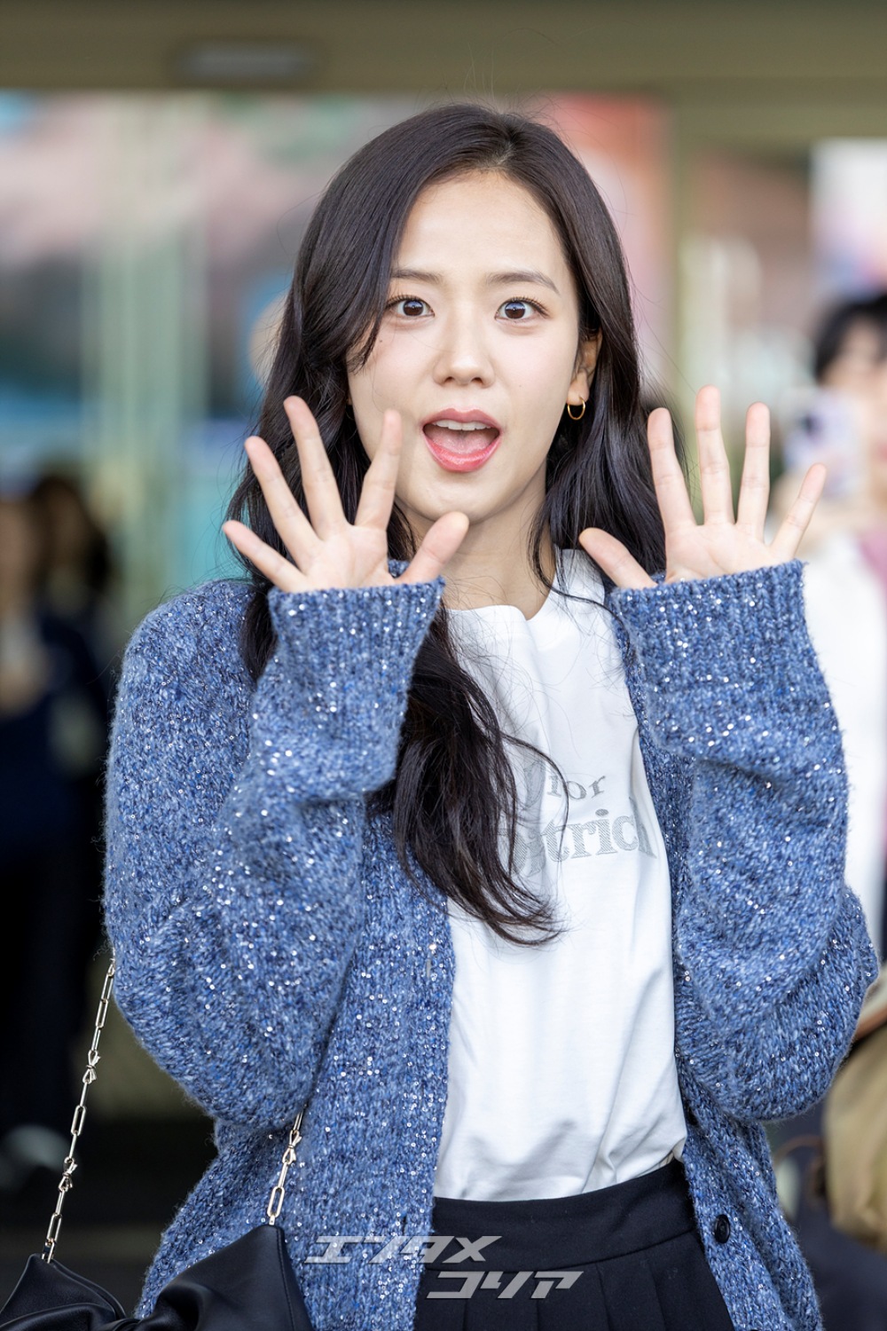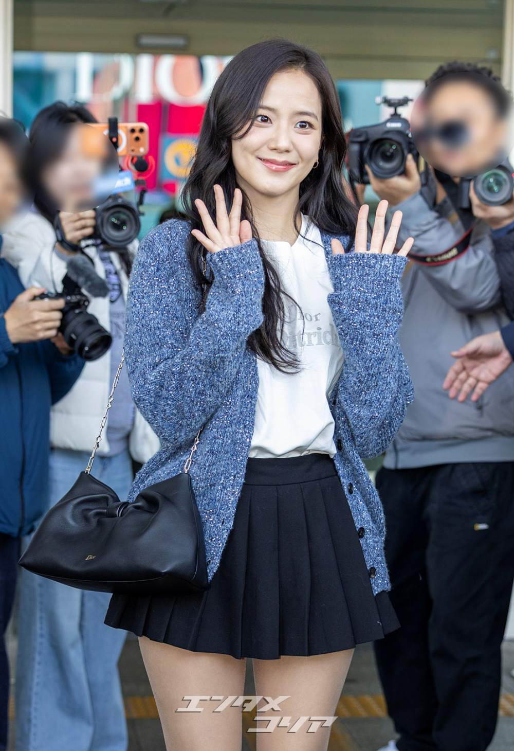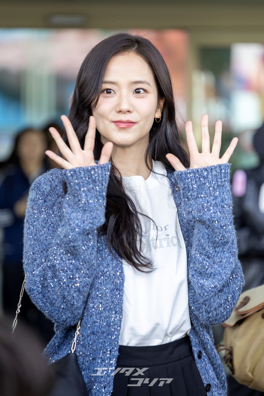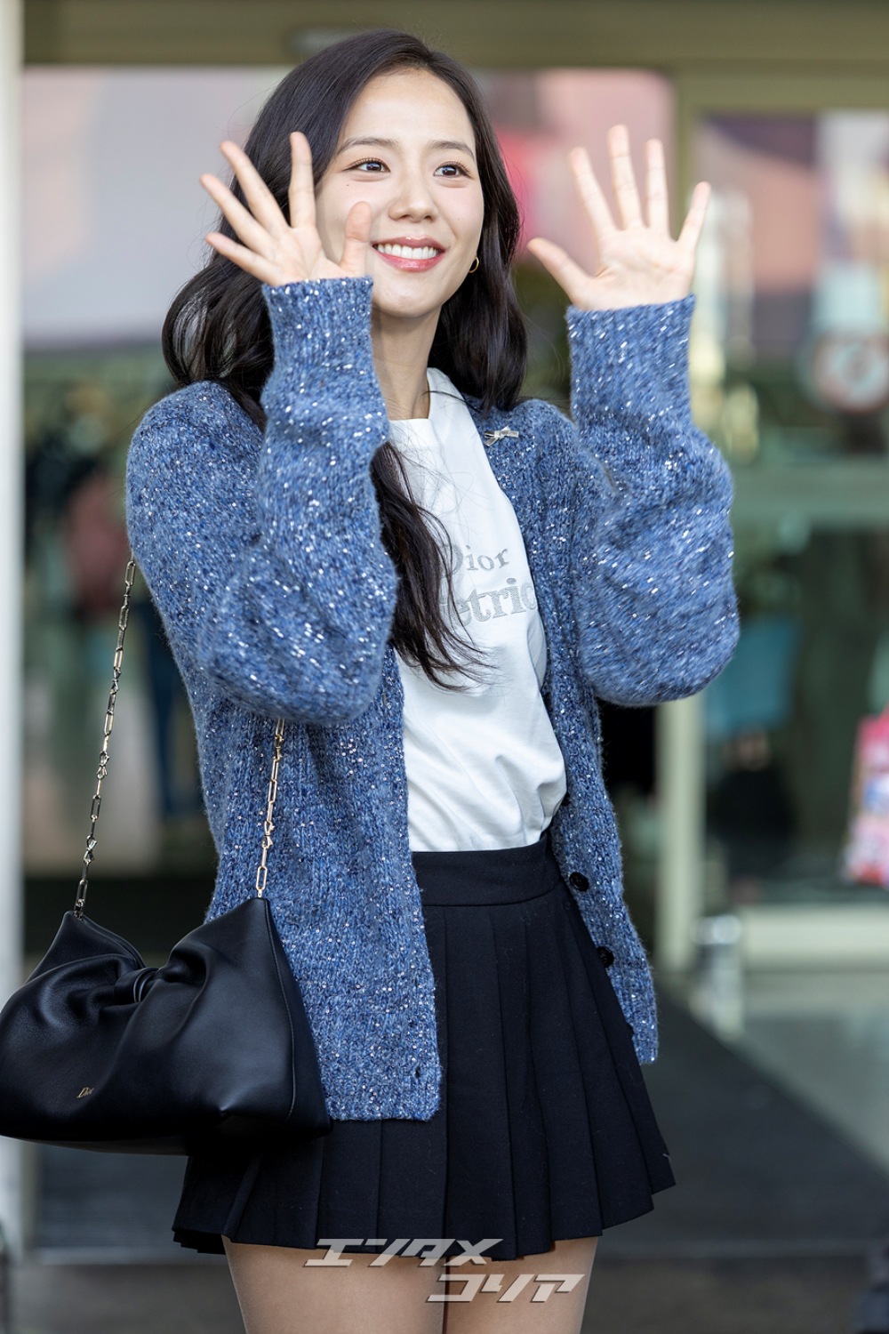 この日のジスはメランジ・ブルーのカーディガンに黒のミニプリーツスカートを合わせ、清楚な印象と共に美脚が際立つ空港ファッションを披露した。