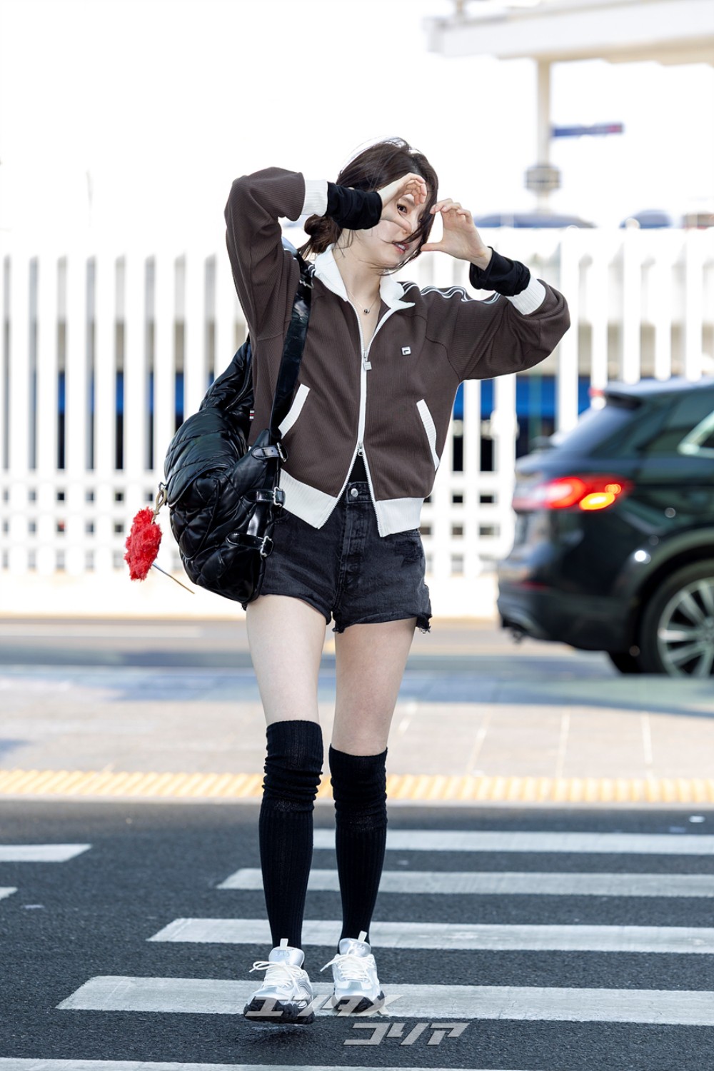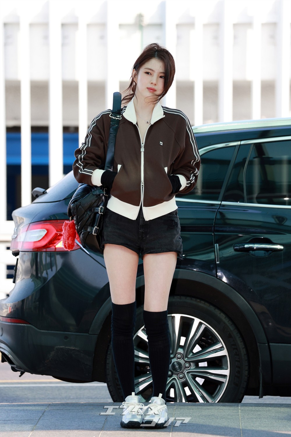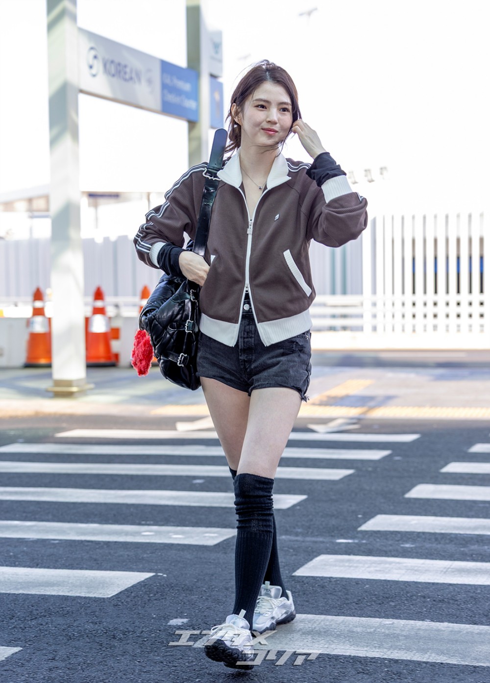 ハン・ソヒはブラウンのトラックジャケットにホットパンツ、ニーソックスを合わせ、セクシーだがカジュアルなフライトコーデを披露した。