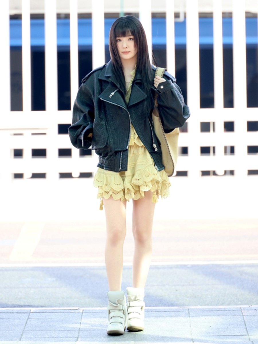 高級感ある革の質感を生かした黒いレザージャケットに、毎シーズン軽くて着心地がいいとして愛されているレース・コットン・ボイル生地を用いたミニ丈の衣装を合わせ、感性的なスタイリングを披露した。また、やわらかいスエード素材のバッグでクールなボヘミアン風のセンスを増していた。