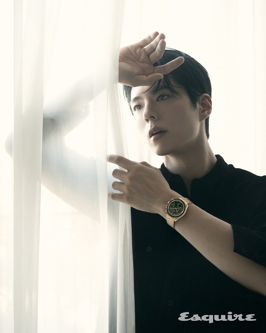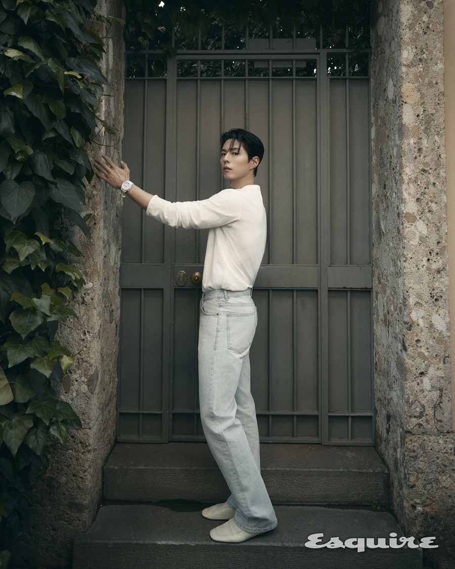 グラビアのパク・ボゴムは、柔らかな眼差しと端正な美しさという多彩な魅力を放ち、視線をさらっている。独特の淡白な表情とフォーマルなスタイルはまるで映画のワンシーンのようだ。