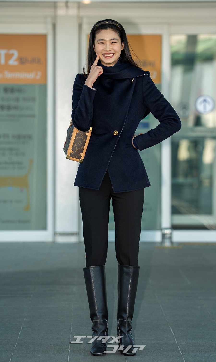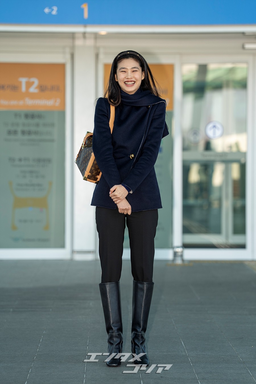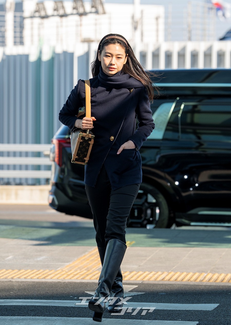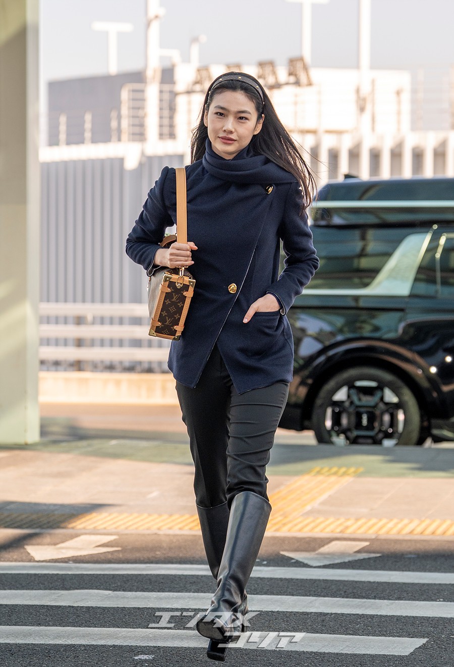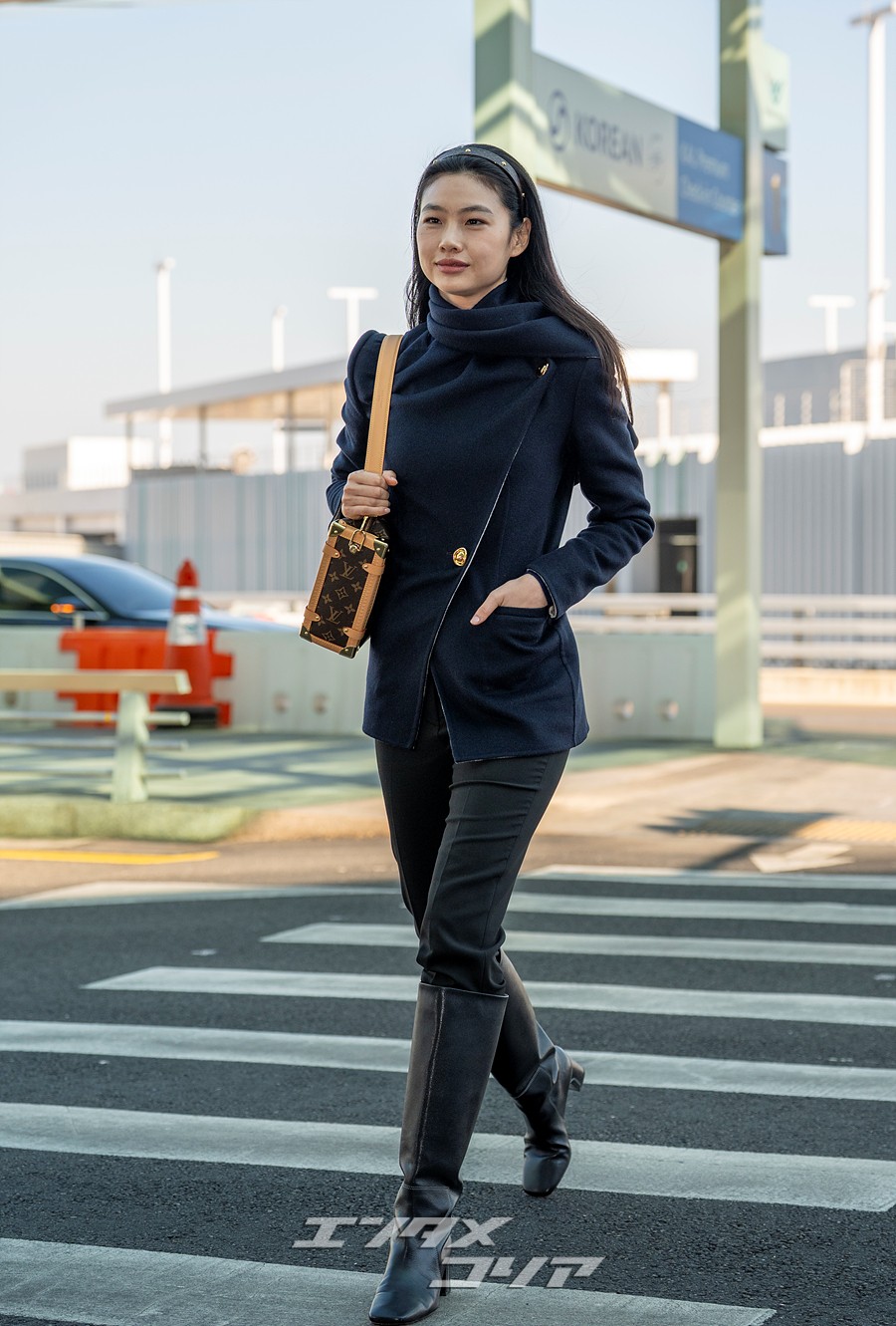 チョン・ホヨンはこの日、長いストレートヘアをおろしてカチューシャを身に着け、ネイビーのジャケットに黒いパンツとロングブーツを合わせていた。また、ブラウンのバッグやミニマルなアクセサリーなどを身に着け、フライトコーデを完成させた。