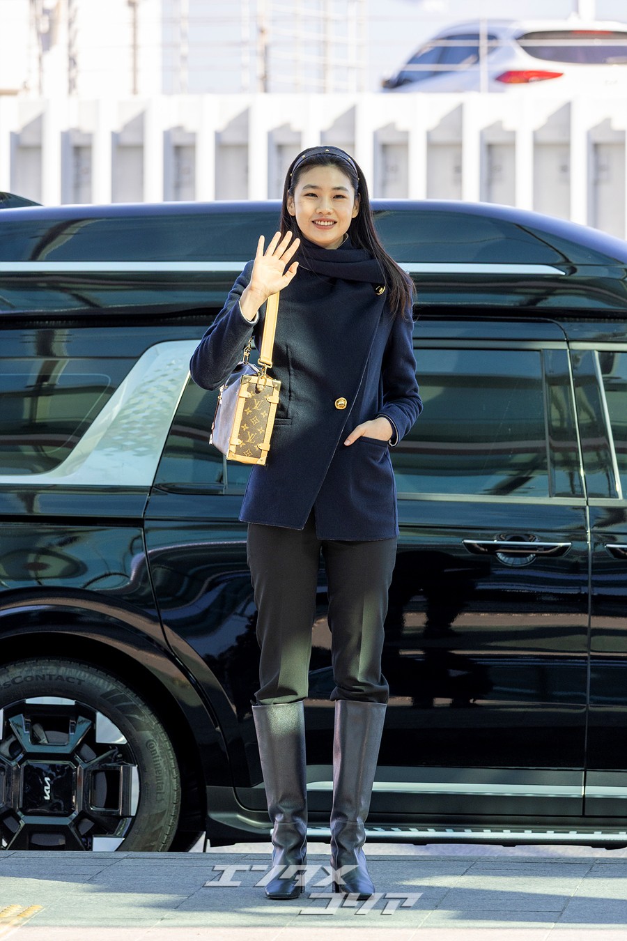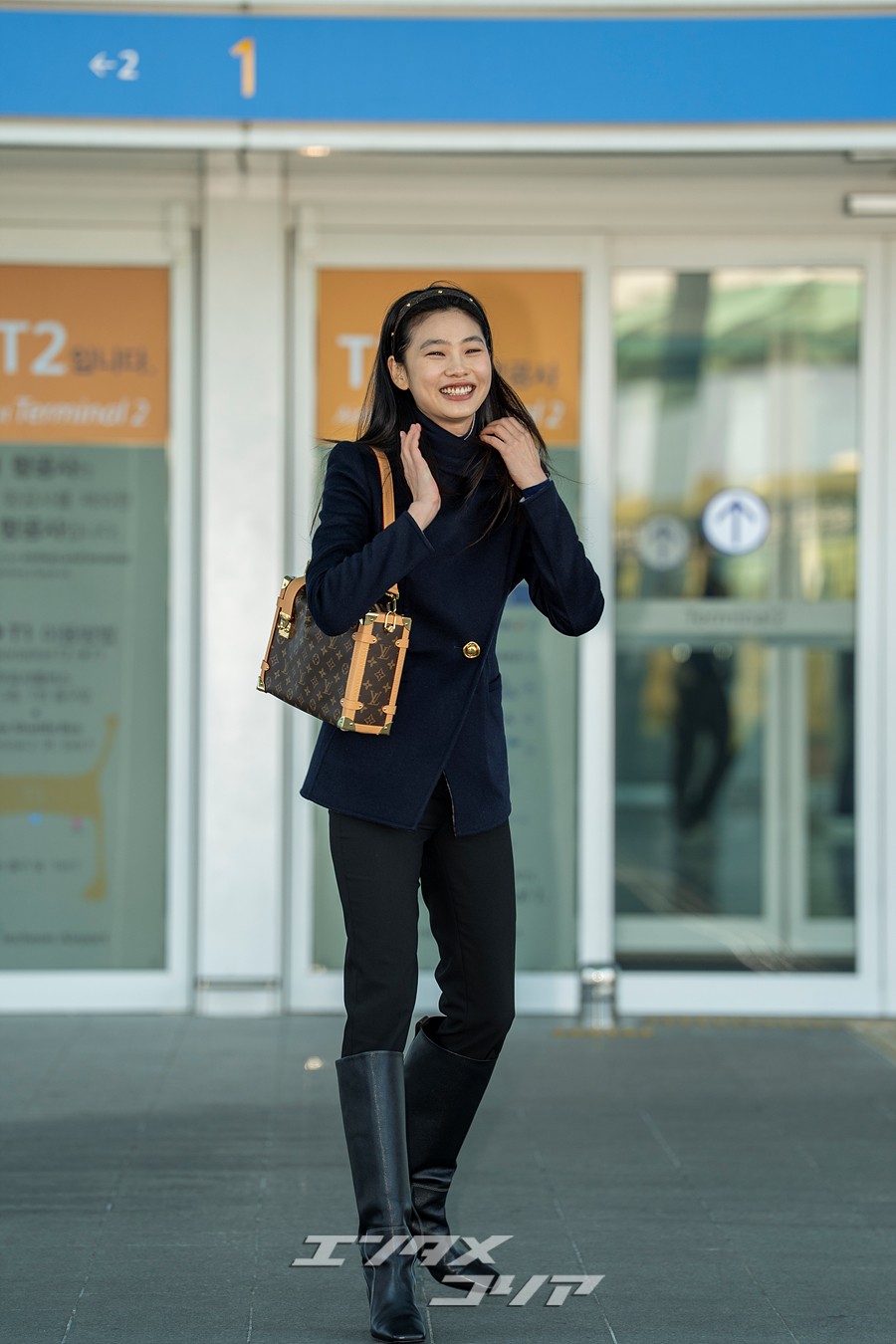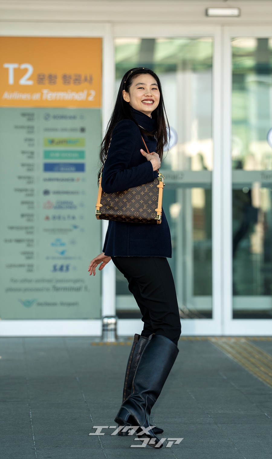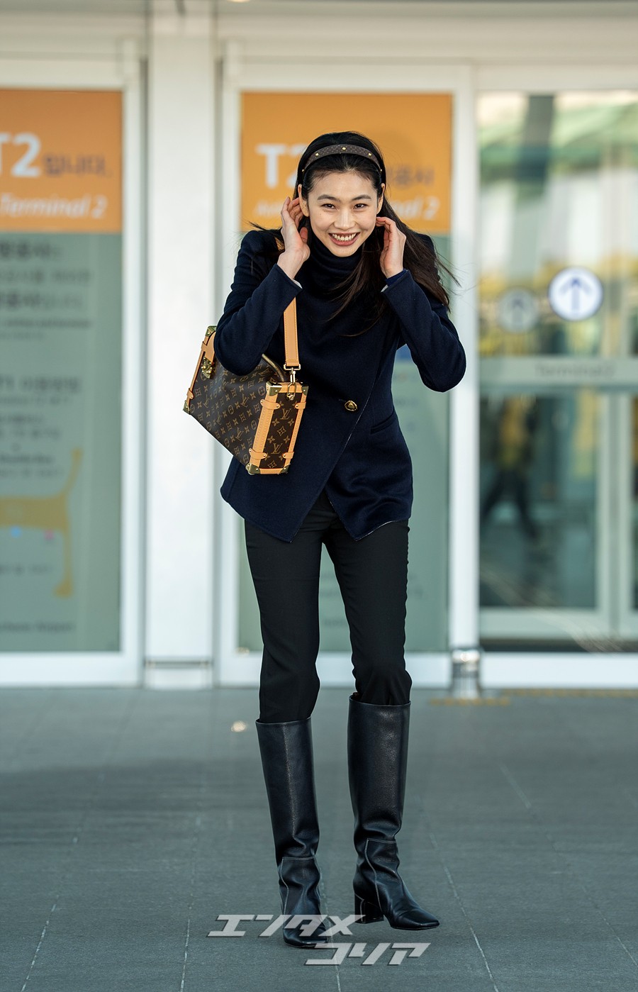 チョン・ホヨンはこの日、長いストレートヘアをおろしてカチューシャを身に着け、ネイビーのジャケットに黒いパンツとロングブーツを合わせていた。また、ブラウンのバッグやミニマルなアクセサリーなどを身に着け、フライトコーデを完成させた。
