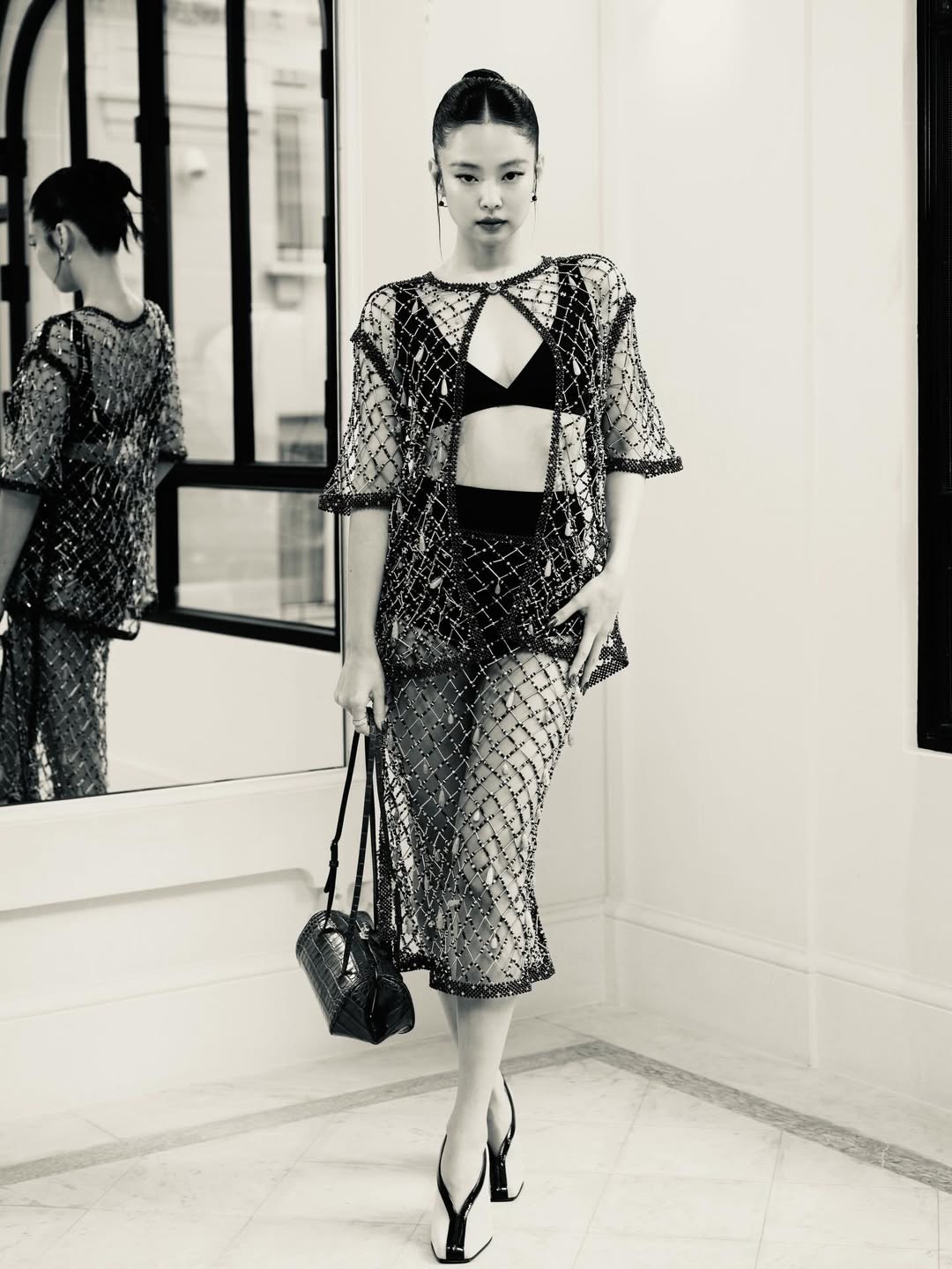 公開された写真を見ると、ジェニーは黒いブラトップとショートパンツにきらめくビーズが散りばめられたシースルーのジャケットとスカートを合わせた大胆なファッションを披露している。堂々とした身のこなしで、あらためて「人間CHANEL」としての姿を見せつけた。