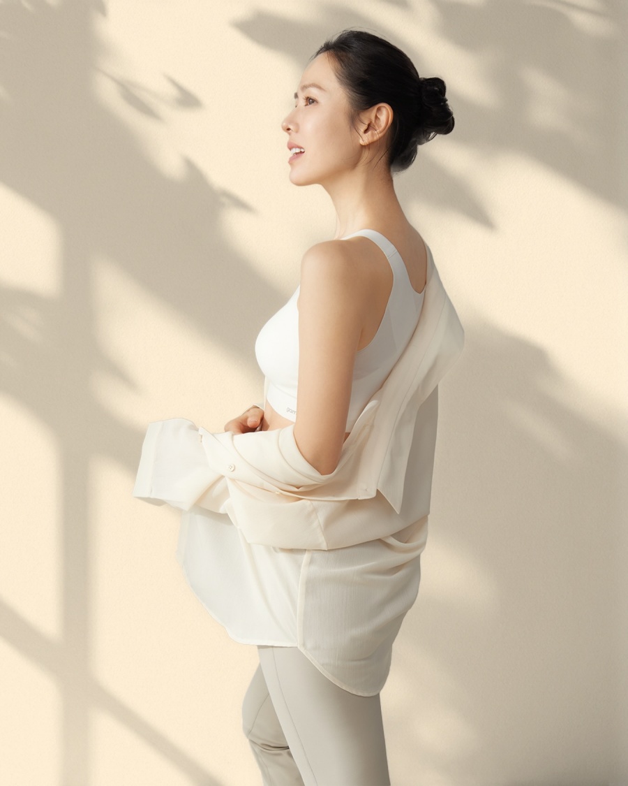 公開された写真を見ると、ソン・イェジンはホルターネックのトップスにベージュのスカートを合わせ、花を1輪手にしている。また別の写真では、白いアンダーウエアを着てシャツを羽織っている。どちらの写真も、軽さと着心地のよさを強調している。