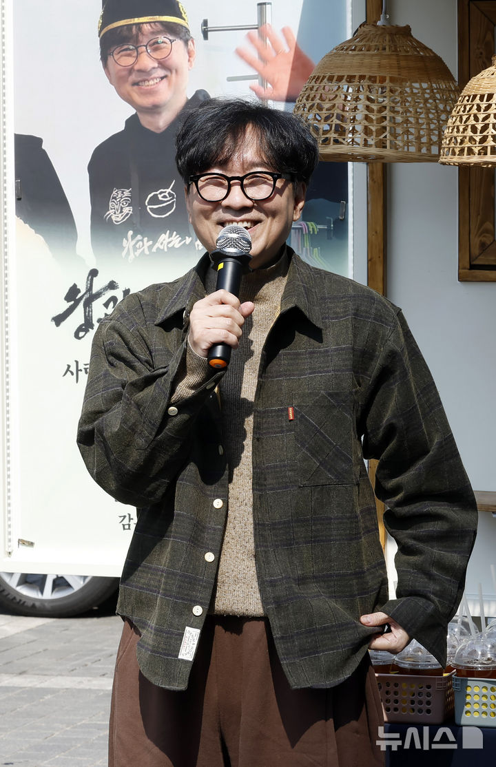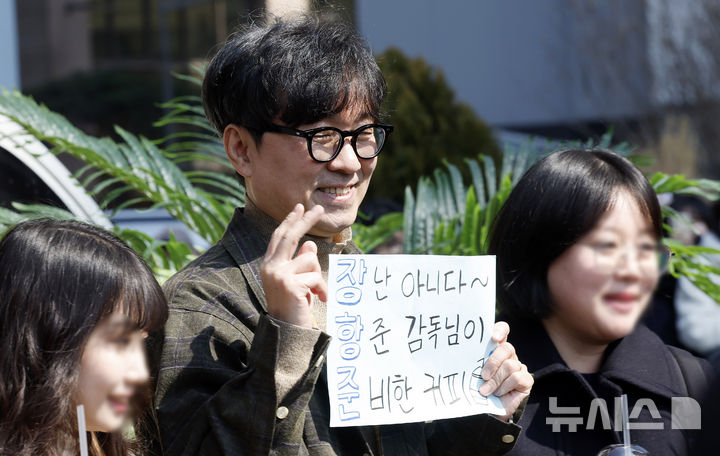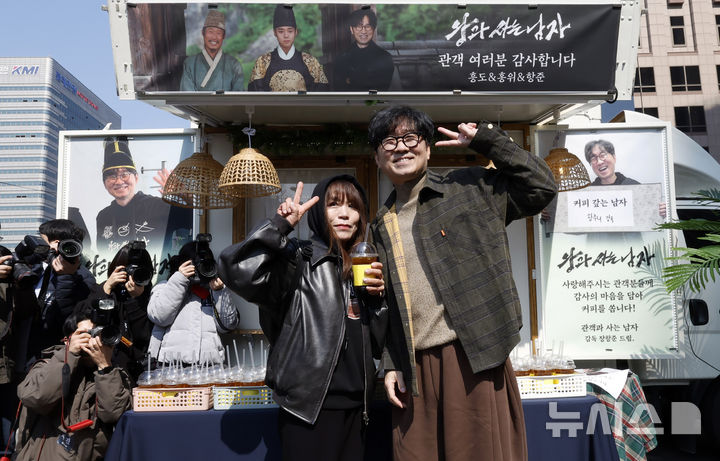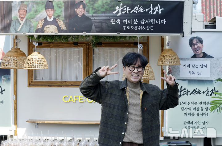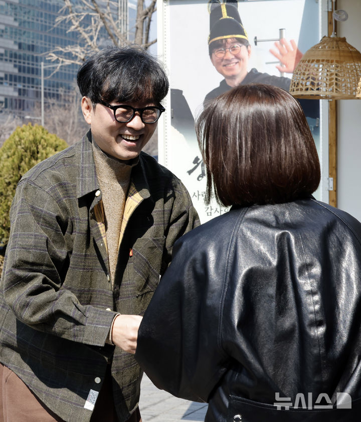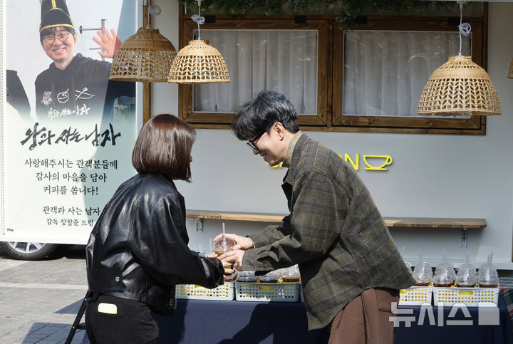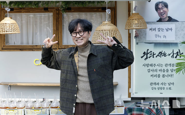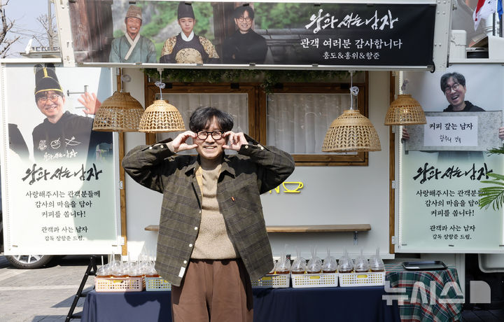 観客1000万人を動員したチャン・ハンジュン監督が12日午後、ソウル市中区のプレスセンター前広場で、映画『王と生きる男』ヒット感謝コーヒートラック・イベントに先立ってポーズを取っている様子。