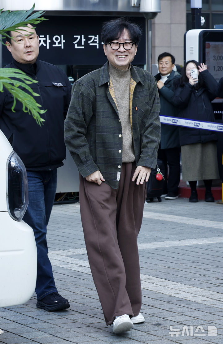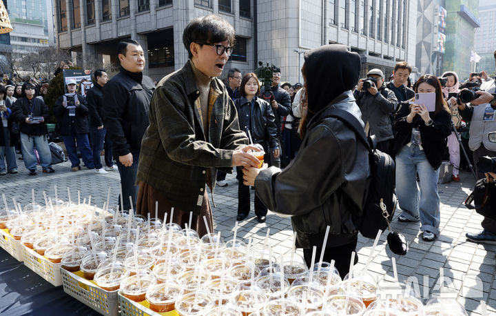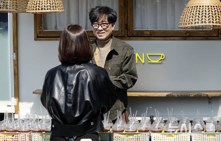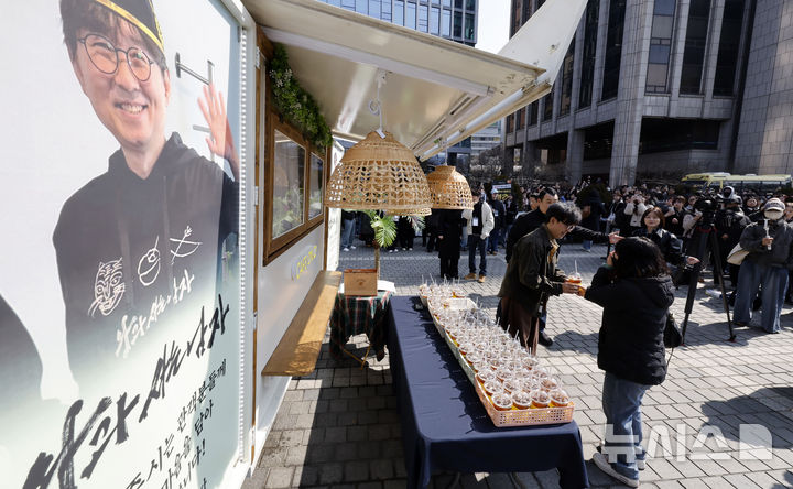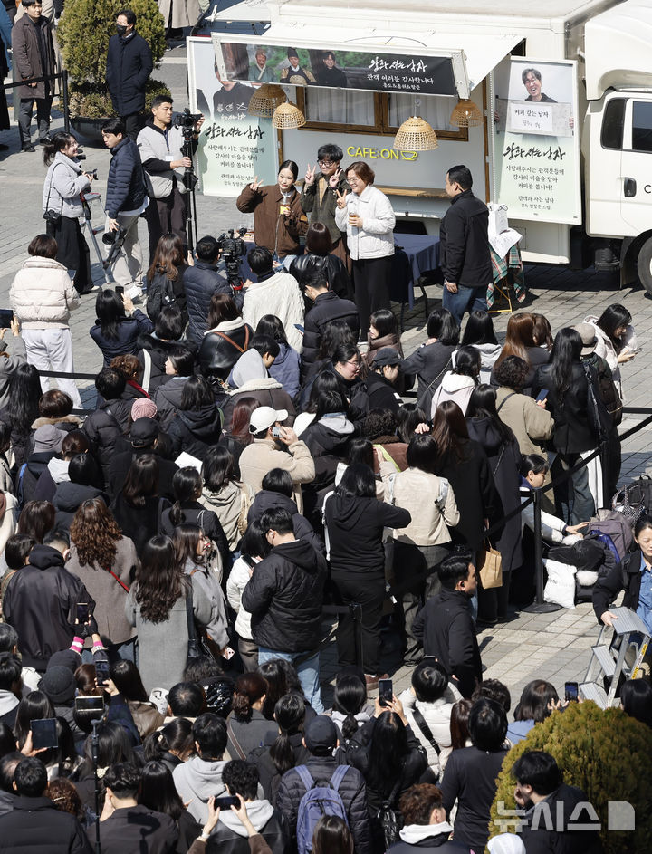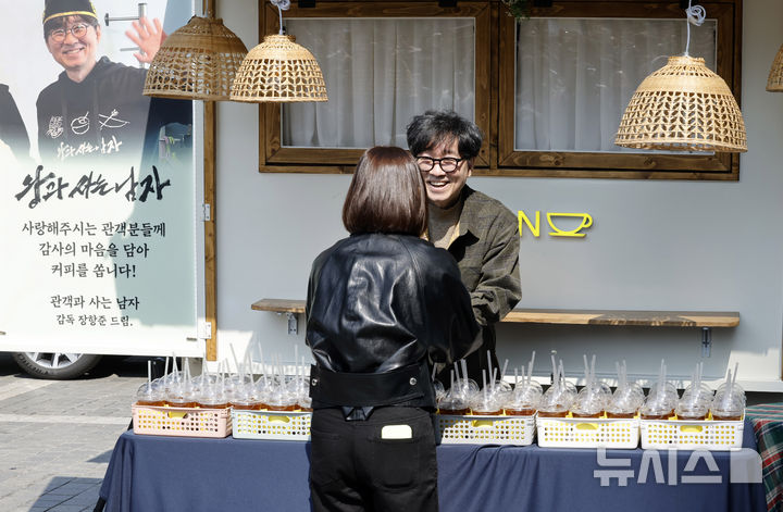観客1000万人を動員したチャン・ハンジュン監督が12日午後、ソウル市中区のプレスセンター前広場で、映画『王と生きる男』ヒット感謝コーヒートラック・イベントに先立ってポーズを取っている様子。