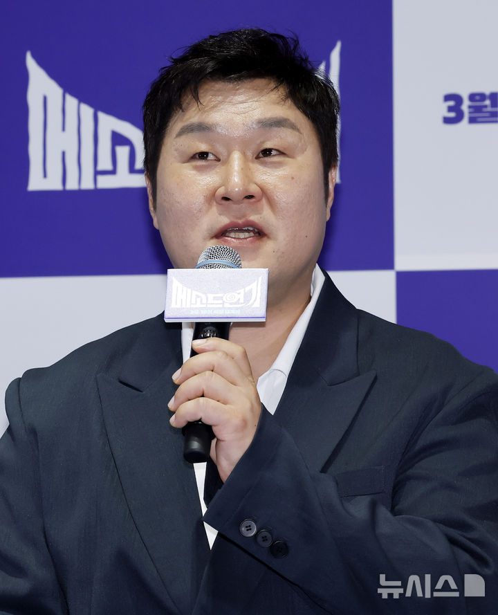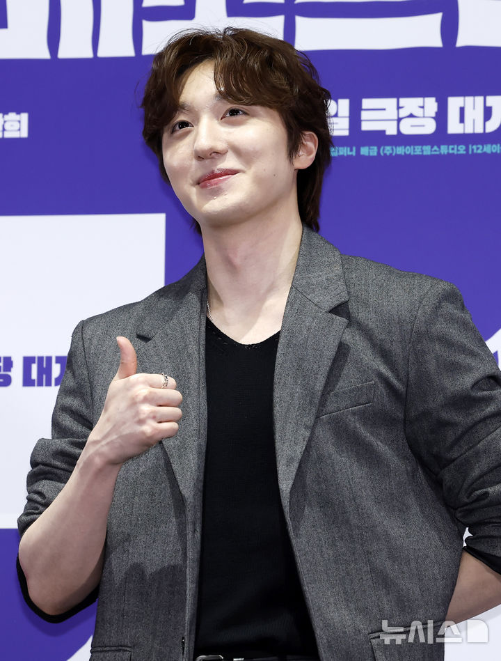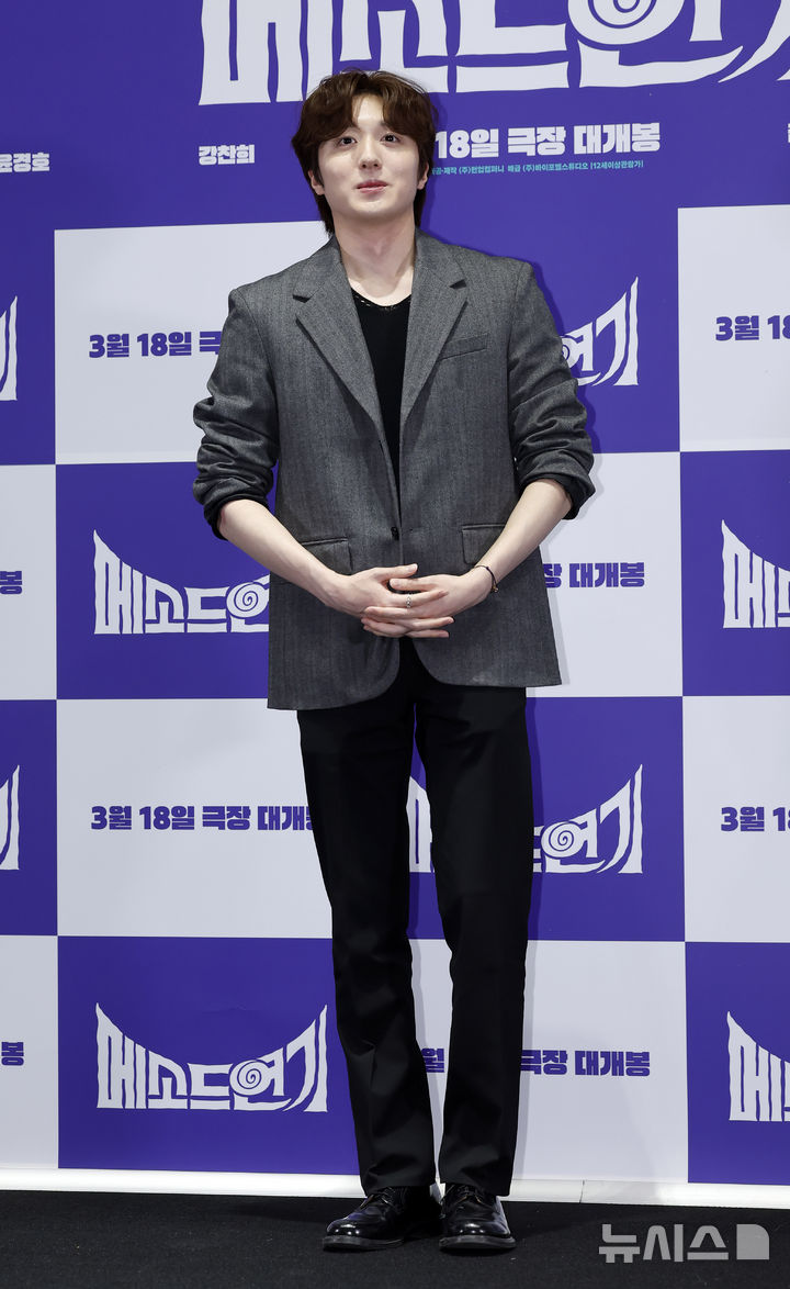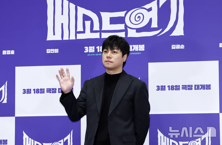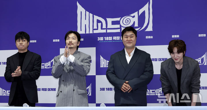 イ・ギヒョク監督、俳優イ・ドンフィ、カン・チャンヒ、ユン・ギョンホ(写真左から)が13日午後、ソウル市江南区の映画館「メガボックスCOEX」で開かれた映画『メソッド演技』のメディア試写会でポーズを取っているところ。