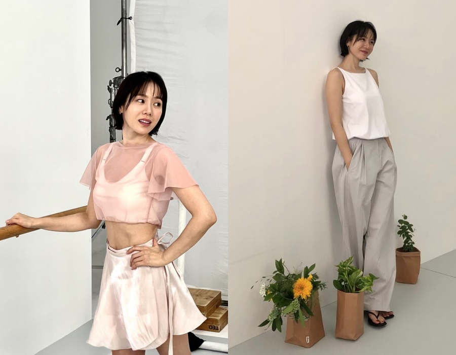 写真のソン・イェジンは、白のスリーブレス・トップスにグレー系のワイドパンツを合わせ、ミニマルでカジュアルなモダン・コーデを披露した。