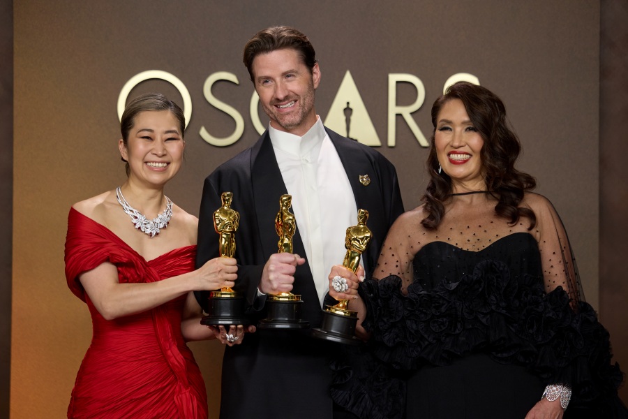 マギー・カン監督、クリス・アッペルハンス共同演出者、L.M.ウォン・プロデューサーが15日(現地時間)、米国カリフォルニア州ロサンゼルスのドルビー・シアターで開かれた第98回アカデミー賞の授賞式で映画『KPOPガールズ! デーモン・ハンターズ』が長編アニメーション賞を取った後、プレスルームで記念撮影をしているところ。