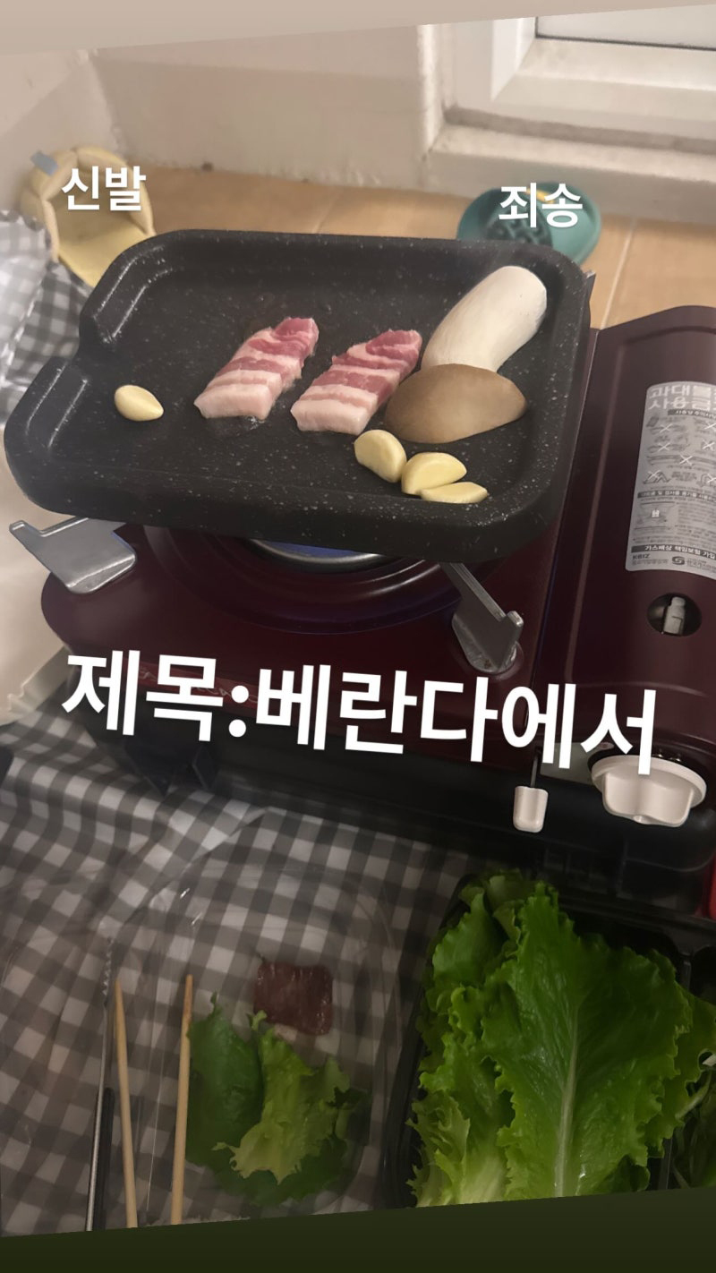 イ・ミジュは15日、ソーシャル・ネットワーキング・サービス(SNS)に「タイトル:ベランダで」というコメントとともに写真を1枚掲載した。公開された写真を見ると、ベランダに鉄板を用意し、サムギョプサル(豚バラ焼き肉)2切れにキノコ、ニンニクなどを焼いている様子が収められている。