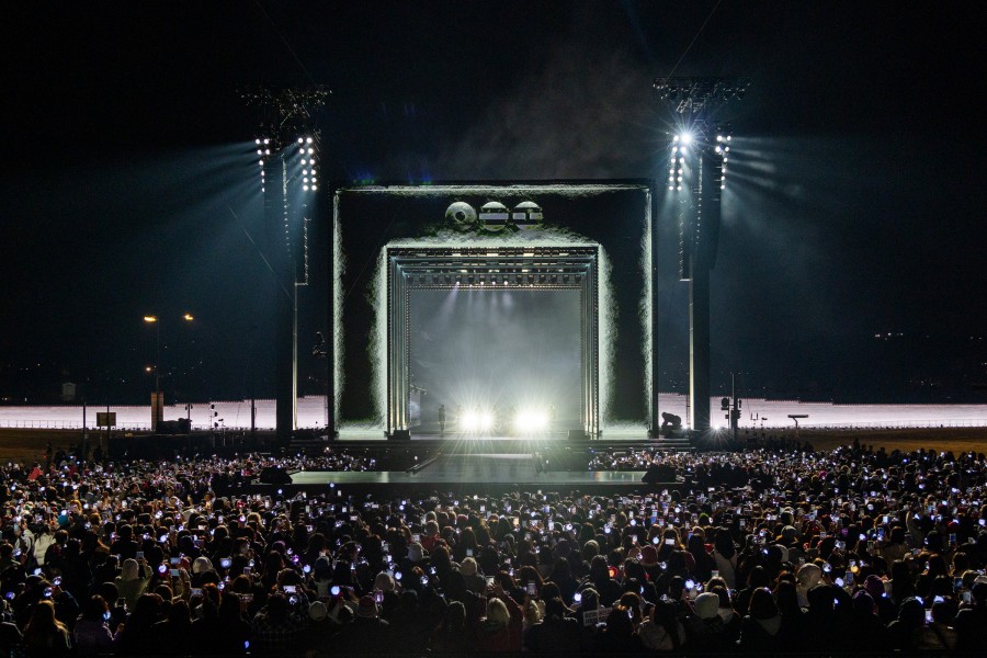 人気グループ防弾少年団(BTS)が21日、ソウル市内の光化門広場で5枚目のフルアルバム「ARIRANG」発売を記念し、「BTS THE COMEBACK LIVE|ARIRANG」と題する無料公演を開催した。写真は、パフォーマンスを披露するメンバーのRM、JIN、SUGA、J-HOPE、JIMIN、V、JUNG KOOK。