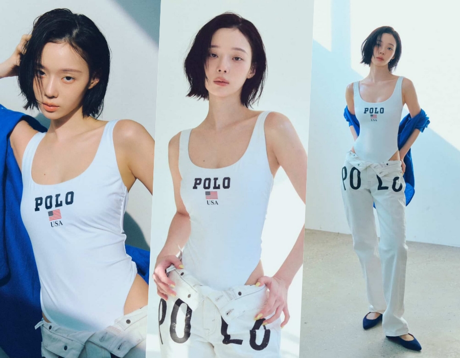最初に公開された写真では、白い水着に大きなロゴがデザインされたパンツを合わせている。特にウィンターは、パンツのウエスト部分を折り返し、きゃしゃなウエストと骨盤のラインを大胆に露出した。