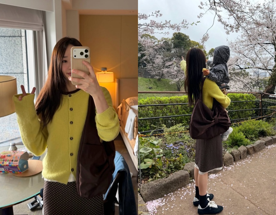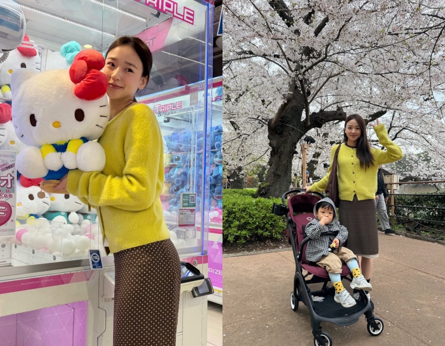 公開された写真を見ると、黄色いカーディガンを着た孫延在が桜の木の下で息子の乗ったベビーカーを押していたり、息子を抱っこして桜の花を眺める後ろ姿など..