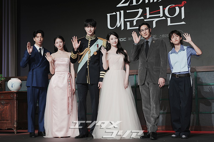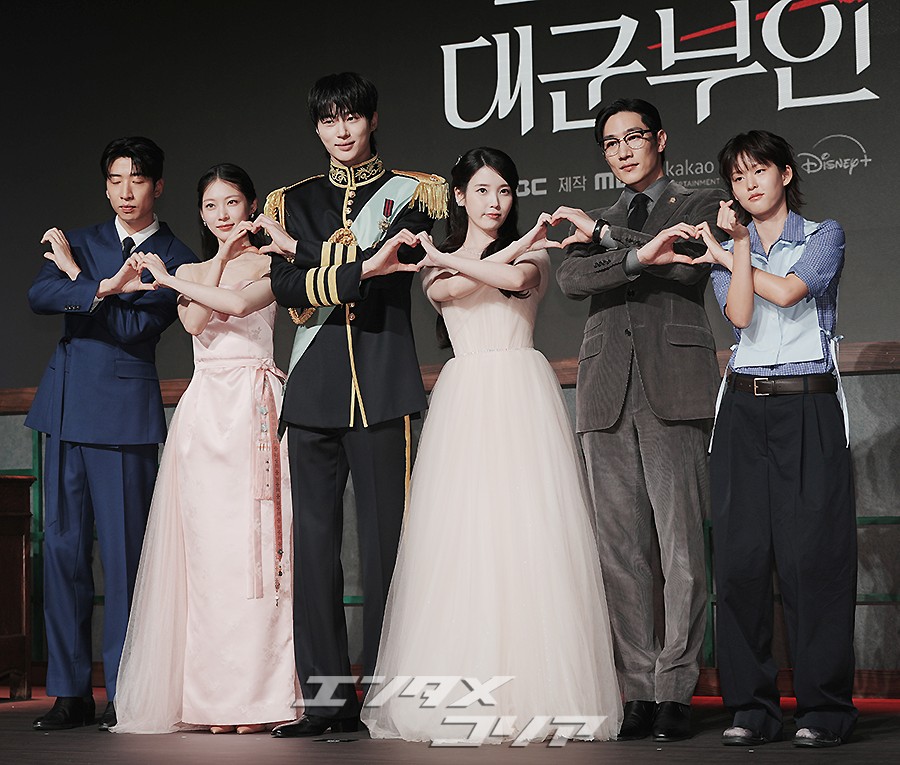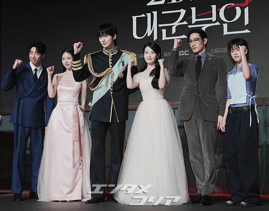 俳優ユ・スビン、コン・スンヨン、ビョン・ウソク、IU(アイユー)、ノ・サンヒョン、イ・ヨン(写真左から)が6日午後、ソウル市江南区のホテル「朝鮮パレス・ソウル・江南」で開かれたMBC新金土ドラマ『21世紀の大君夫人』(ユ・ジウォン脚本、パク・ジュンファ演出)の制作発表会でポーズを取っているところ。
