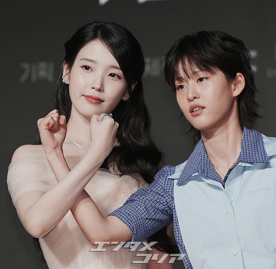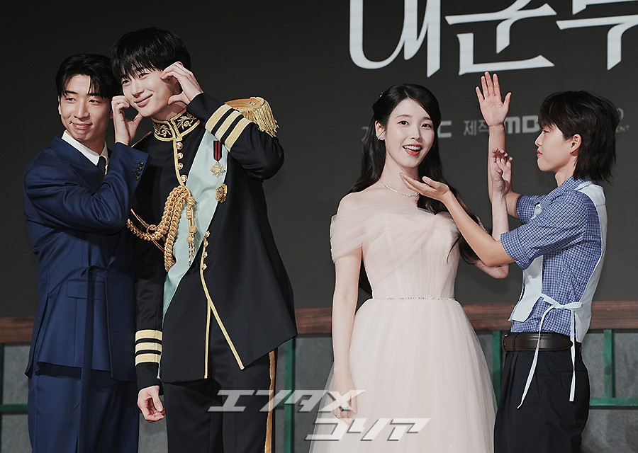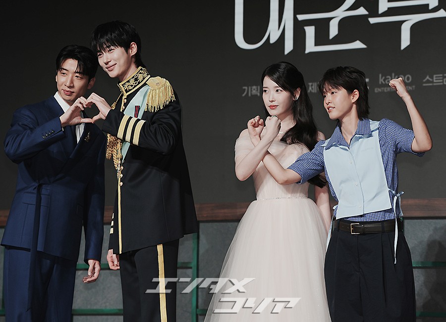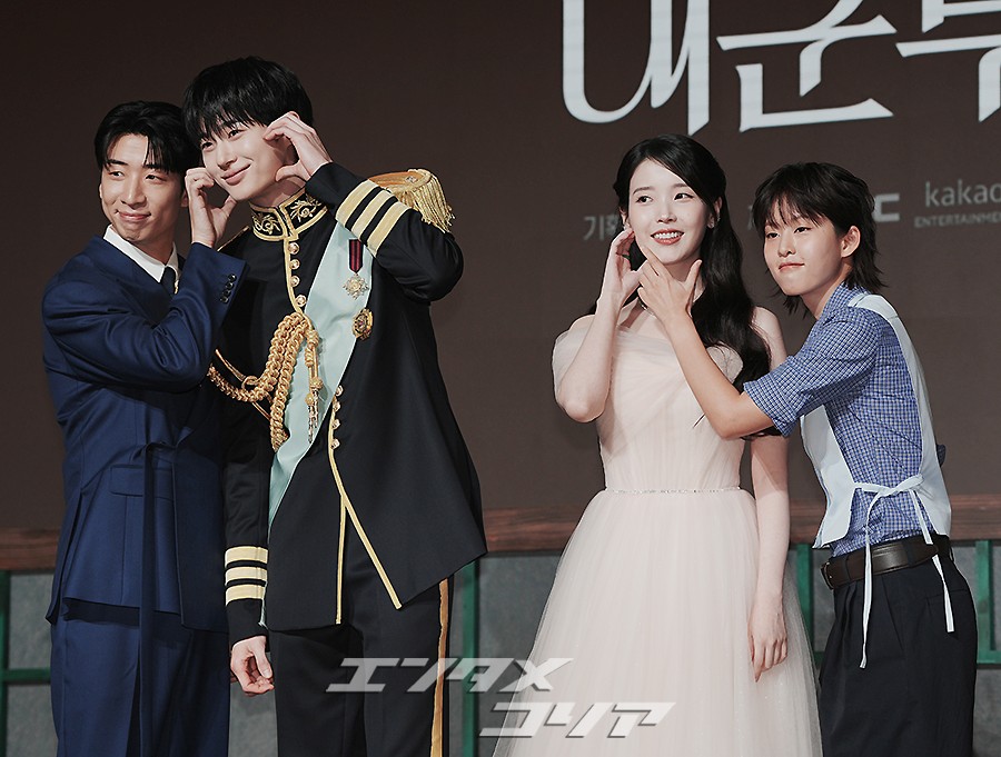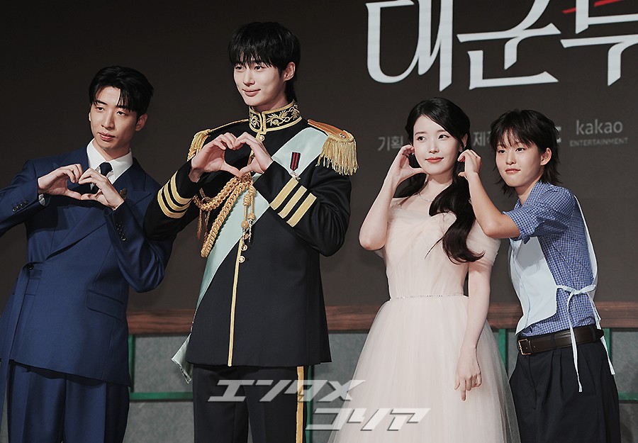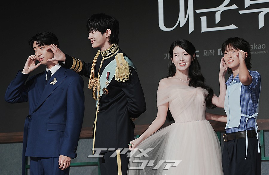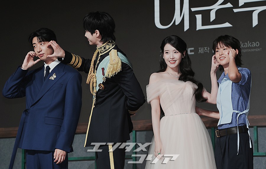 俳優ユ・スビン、コン・スンヨン、ビョン・ウソク、IU(アイユー)、ノ・サンヒョン、イ・ヨン(写真左から)が6日午後、ソウル市江南区のホテル「朝鮮パレス・ソウル・江南」で開かれたMBC新金土ドラマ『21世紀の大君夫人』(ユ・ジウォン脚本、パク・ジュンファ演出)の制作発表会でポーズを取っているところ。