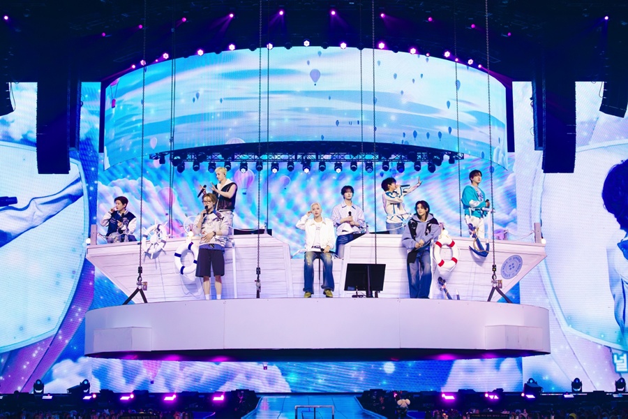 3月25日にデビュー8周年を迎え、STAYにプレゼントした新曲「星、光(STAY)」の初公開ステージはまさにハイライトだった。8人のメンバーは船の形をしたリフトに乗って舞い上がり、2階・3階席の観客と間近で視線を合わせた。ファンたちは色とりどりのペンライトを振り、美しい星明かりのように会場を彩った。