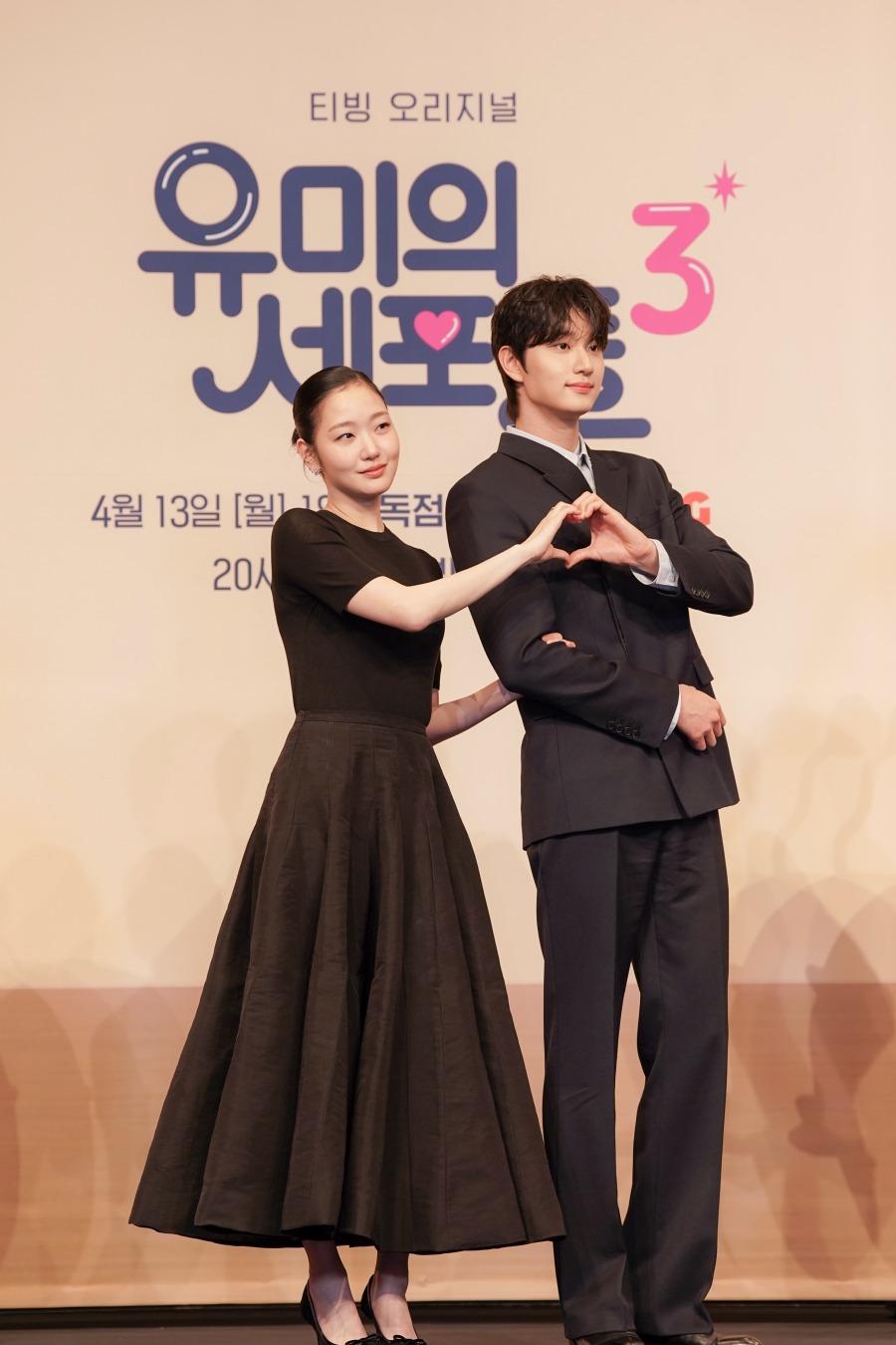 イ・サンヨプ監督と俳優キム・ゴウン、キム・ジェウォン(写真左から)が7日、ソウル市九老区のホテル「ザ・リンク・ソウル」で開かれたTVINGオリジナル『ユミの細胞たち3』の制作発表会でポーズを取っているところ。