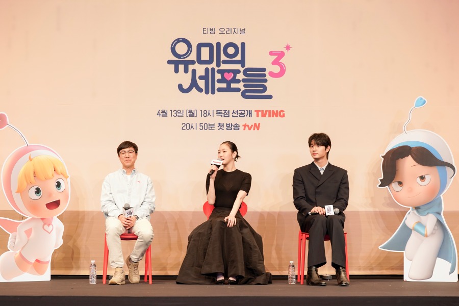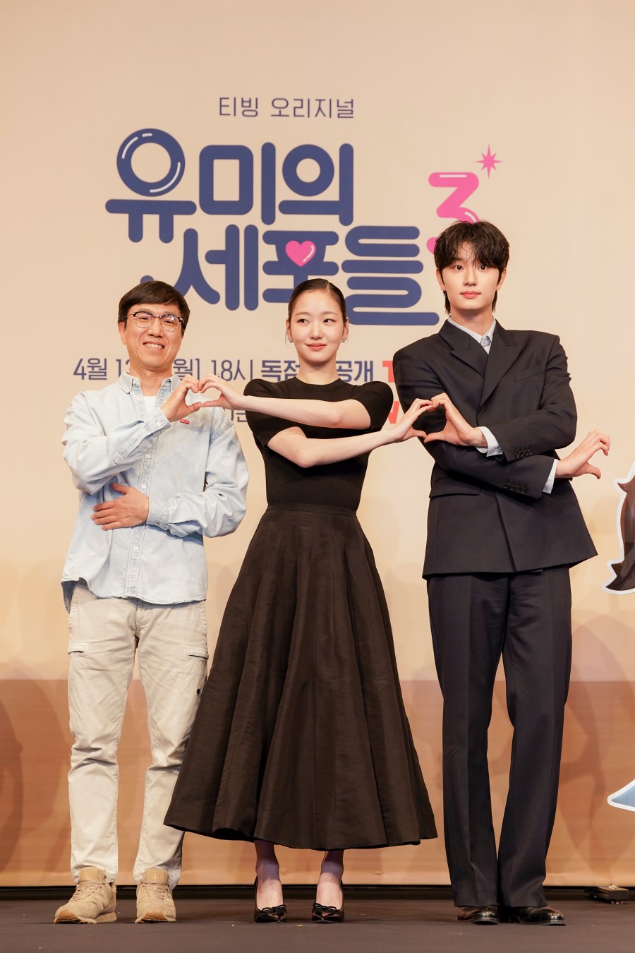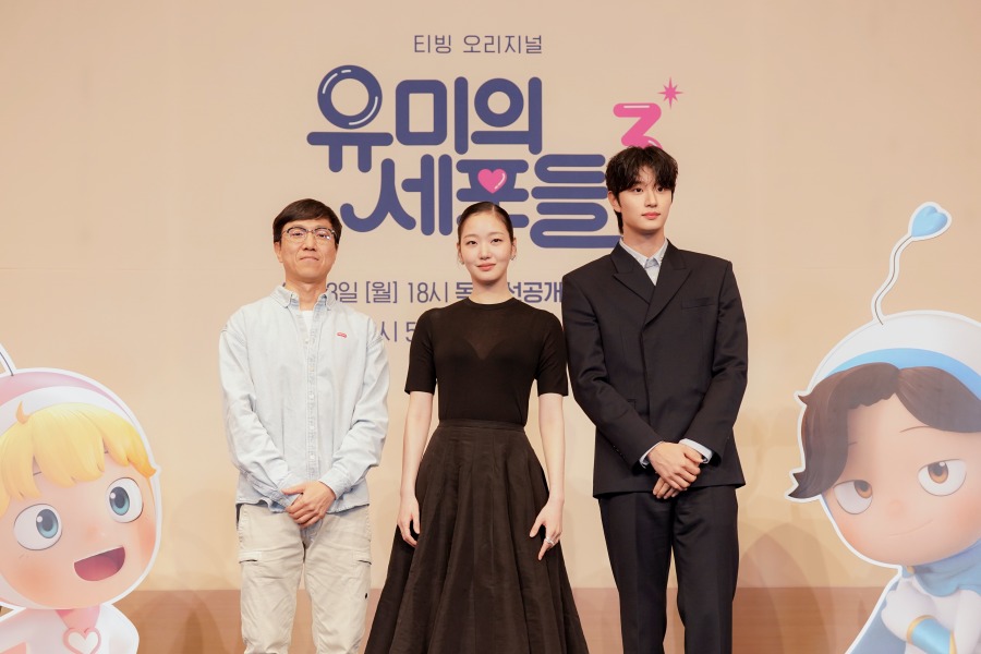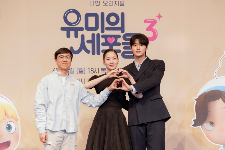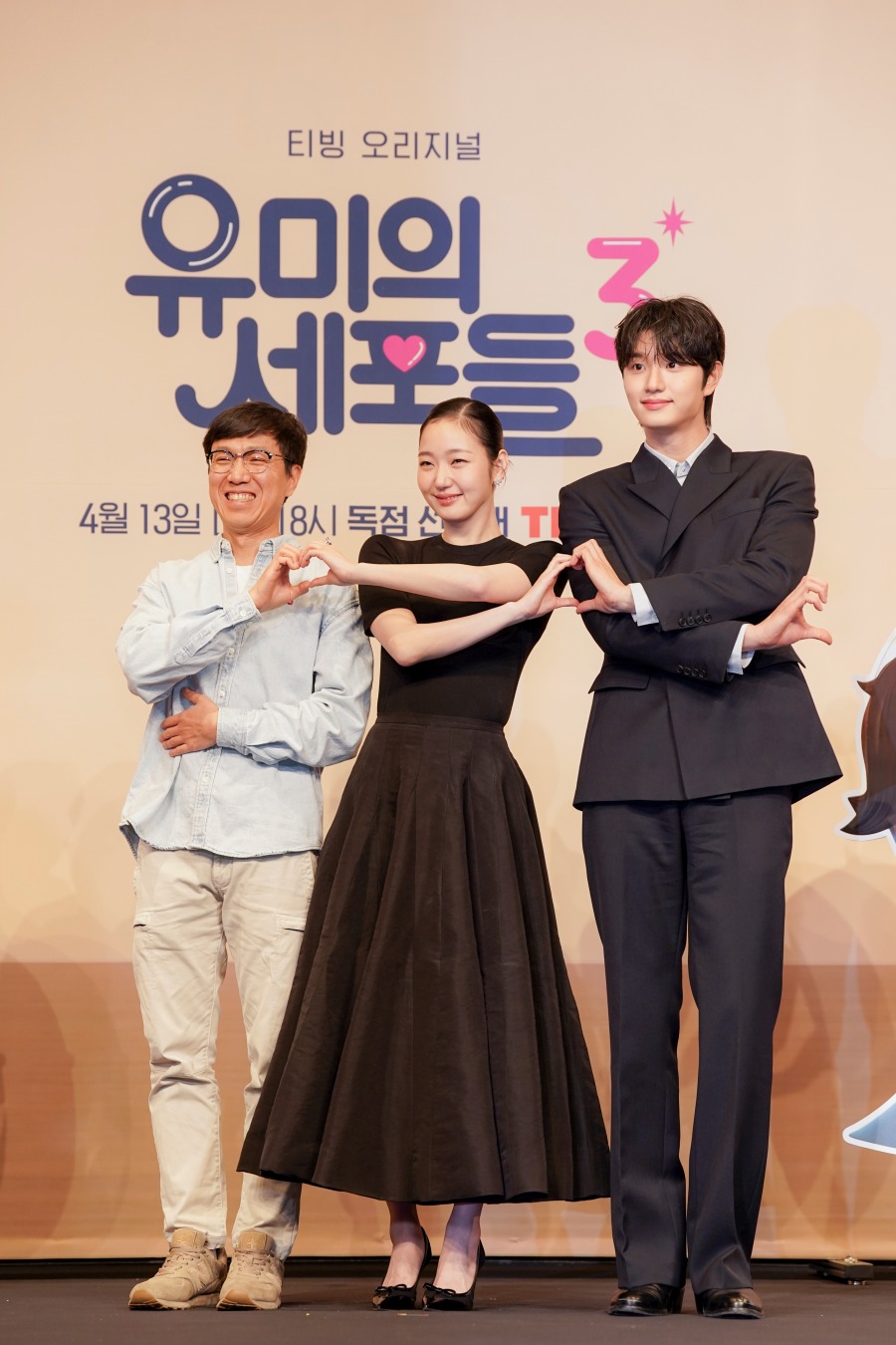 イ・サンヨプ監督と俳優キム・ゴウン、キム・ジェウォン(写真左から)が7日、ソウル市九老区のホテル「ザ・リンク・ソウル」で開かれたTVINGオリジナル『ユミの細胞たち3』の制作発表会でポーズを取っているところ。
