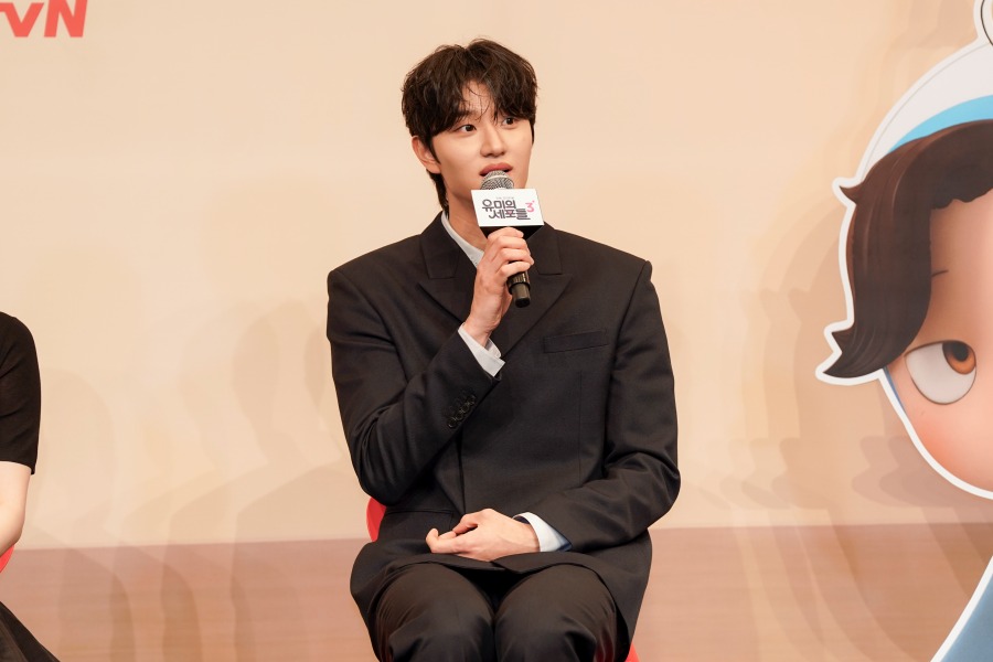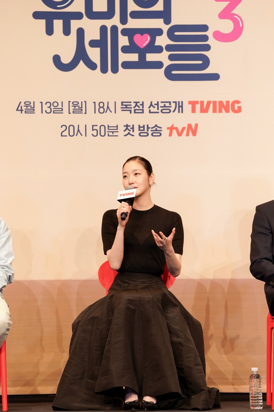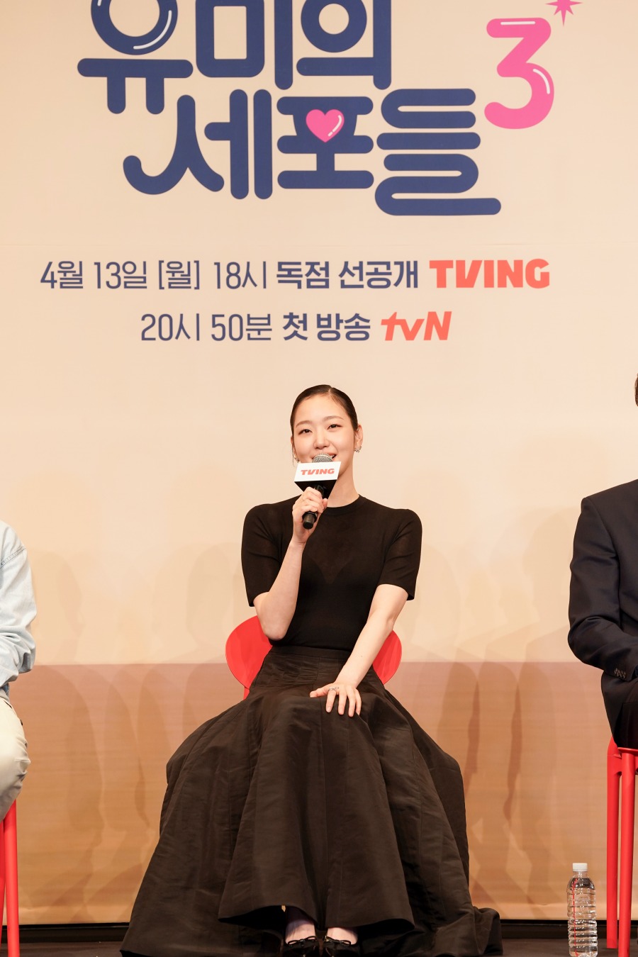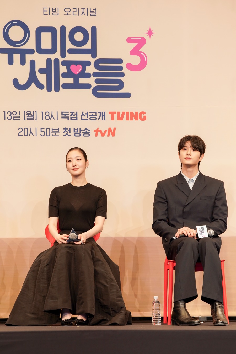 イ・サンヨプ監督と俳優キム・ゴウン、キム・ジェウォン(写真左から)が7日、ソウル市九老区のホテル「ザ・リンク・ソウル」で開かれたTVINGオリジナル『ユミの細胞たち3』の制作発表会でポーズを取っているところ。