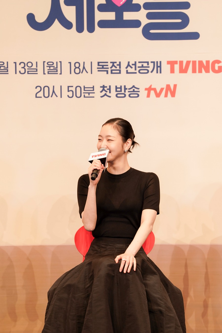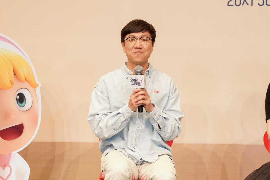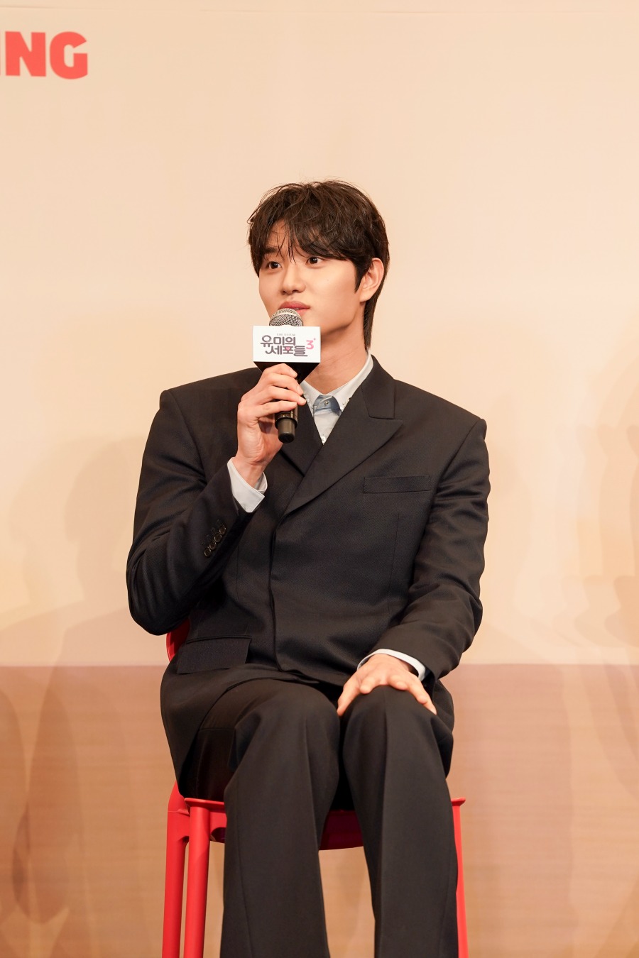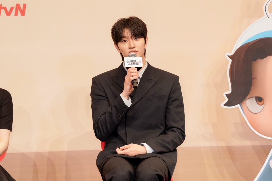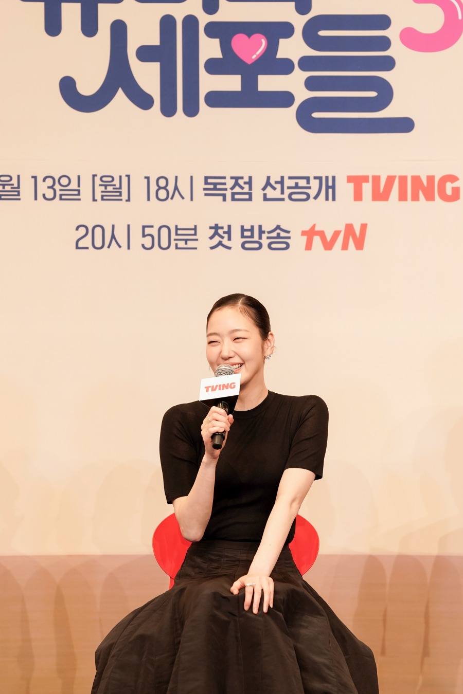 イ・サンヨプ監督と俳優キム・ゴウン、キム・ジェウォン(写真左から)が7日、ソウル市九老区のホテル「ザ・リンク・ソウル」で開かれたTVINGオリジナル『ユミの細胞たち3』の制作発表会でポーズを取っているところ。
