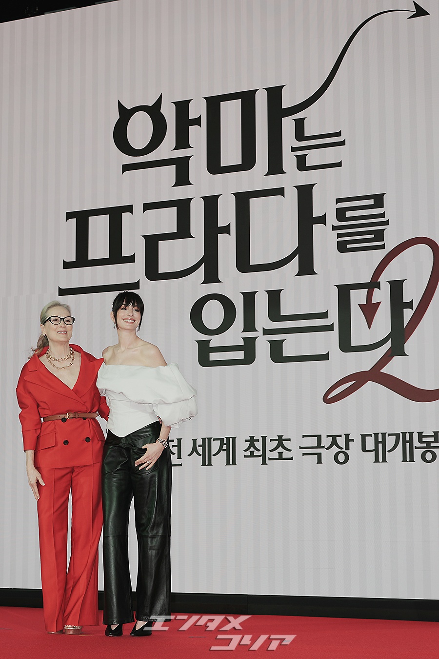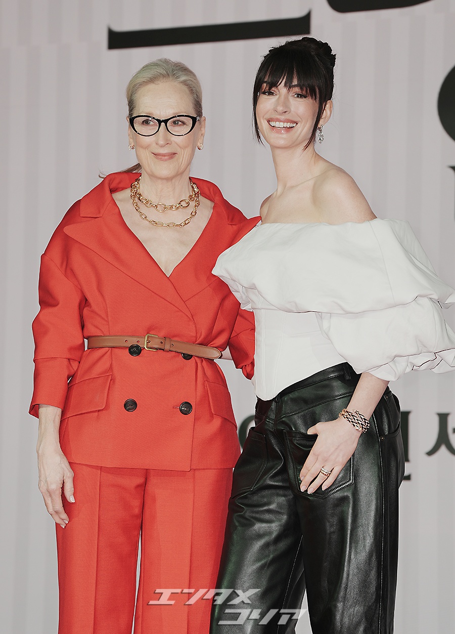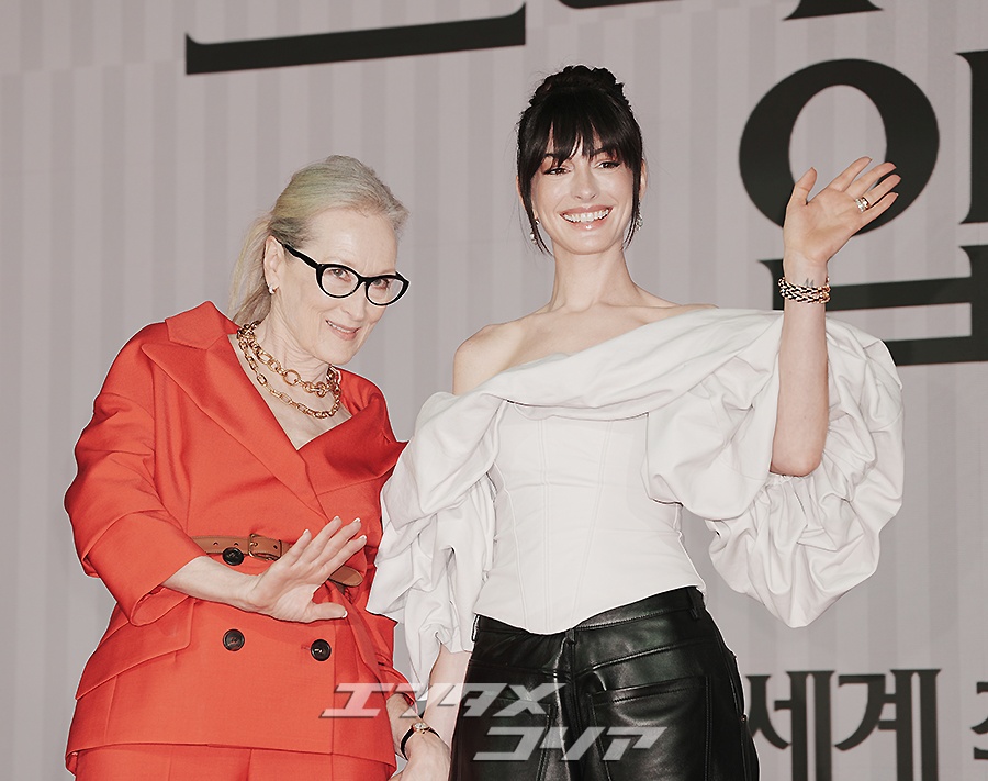 女優メリル・ストリープ(写真左)とアン・ハサウェイが8日午前、ソウル市鍾路区のフォーシーズンズ・ホテル・ソウルで行われた映画『プラダを着た悪魔2』の記者懇談会に出席し、フォトタイムに応じた。