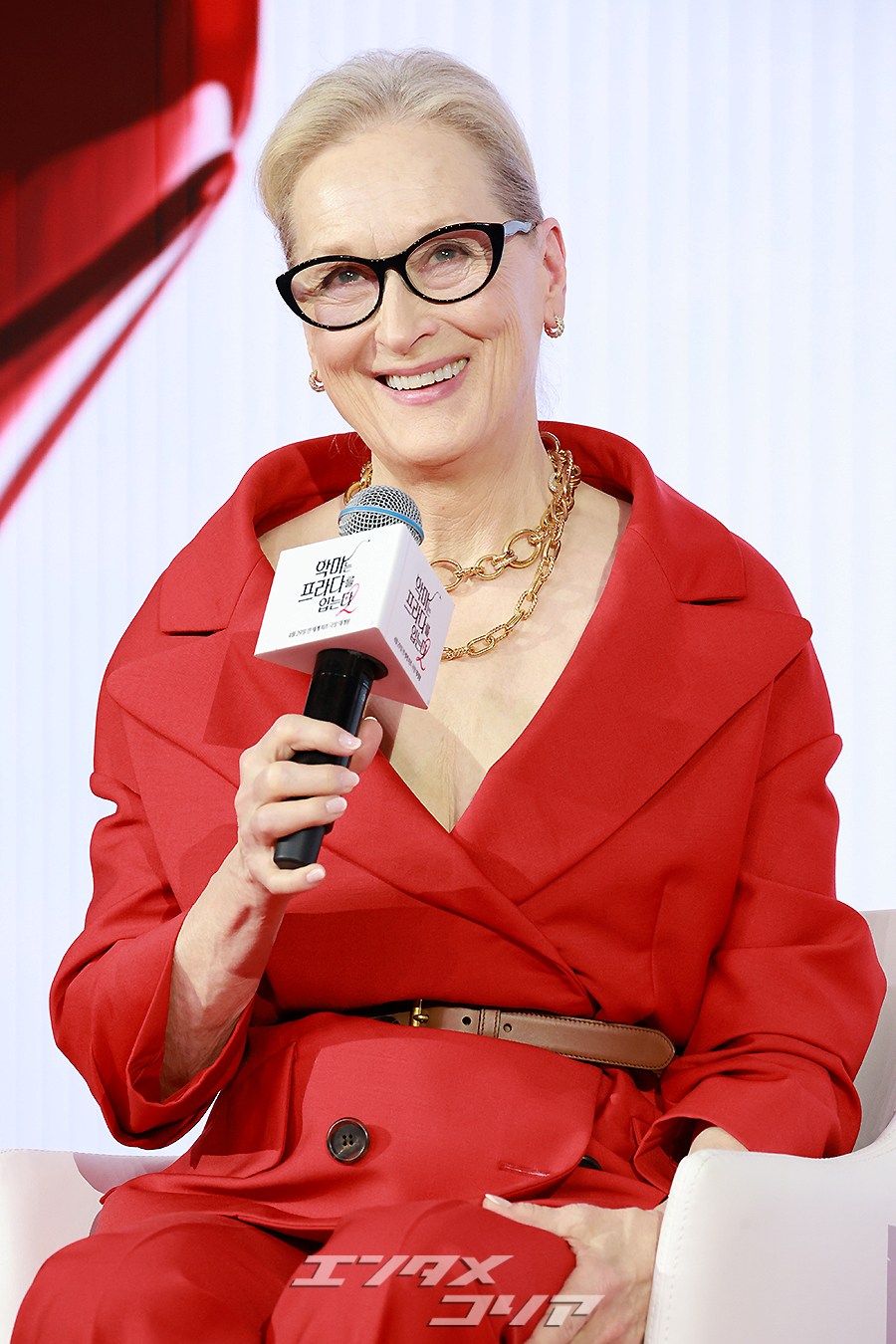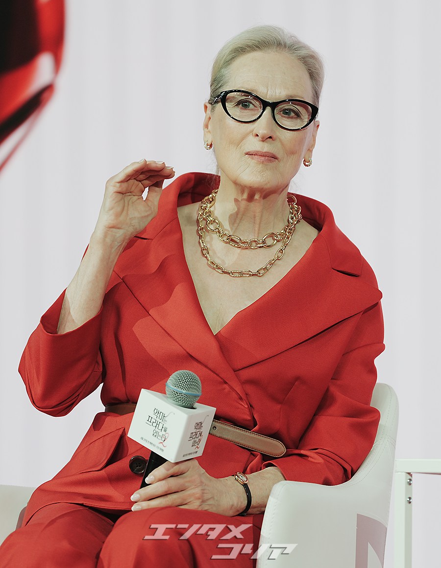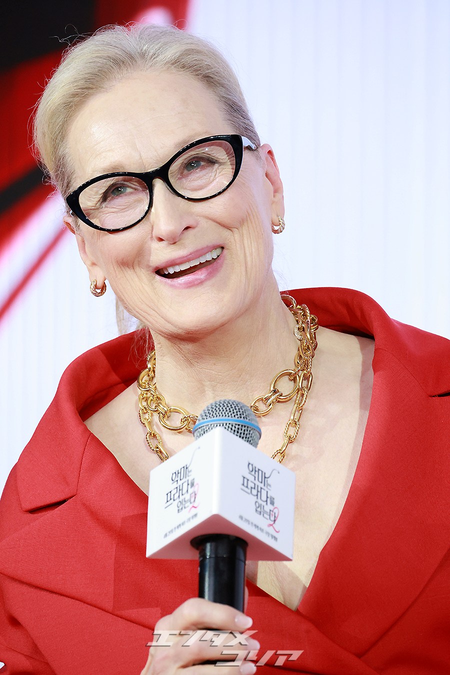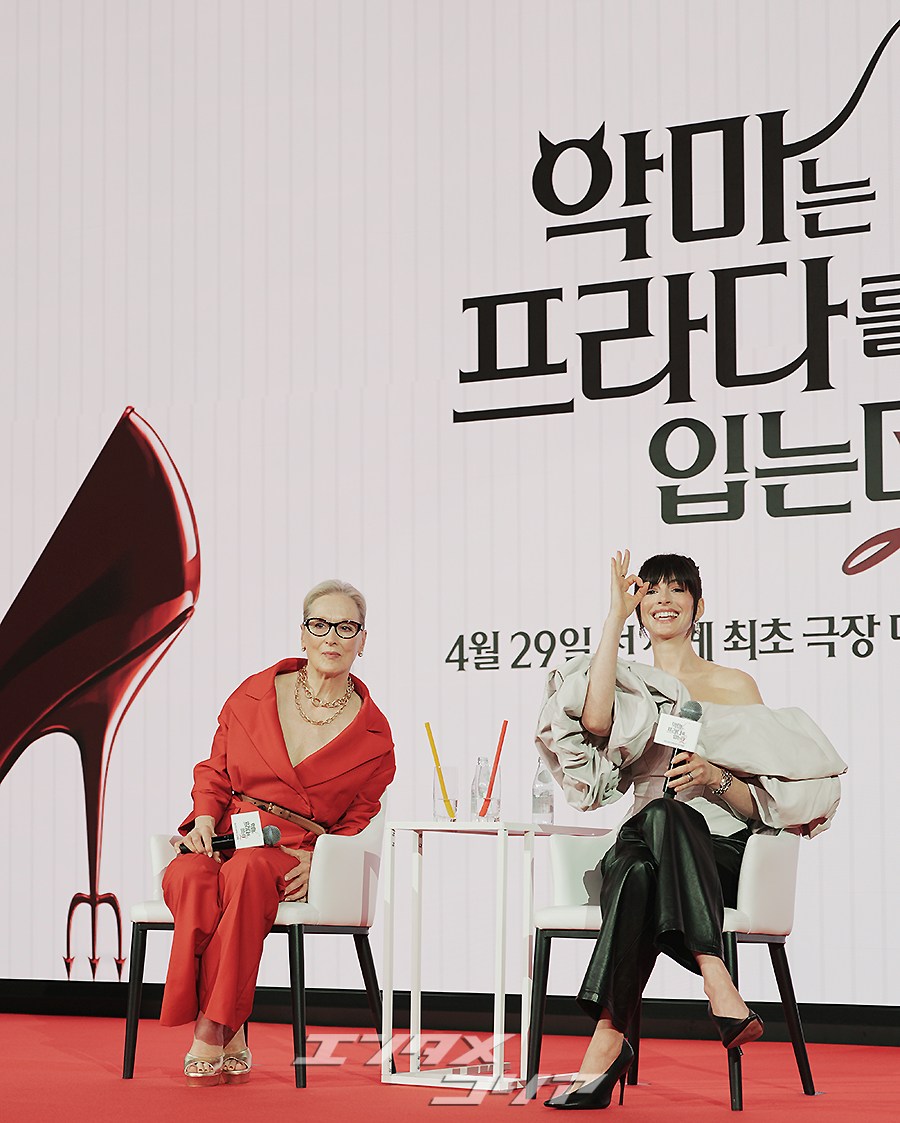 女優メリル・ストリープ(写真左)とアン・ハサウェイが8日午前、ソウル市鍾路区のフォーシーズンズ・ホテル・ソウルで行われた映画『プラダを着た悪魔2』の記者懇談会に出席し、フォトタイムに応じた。