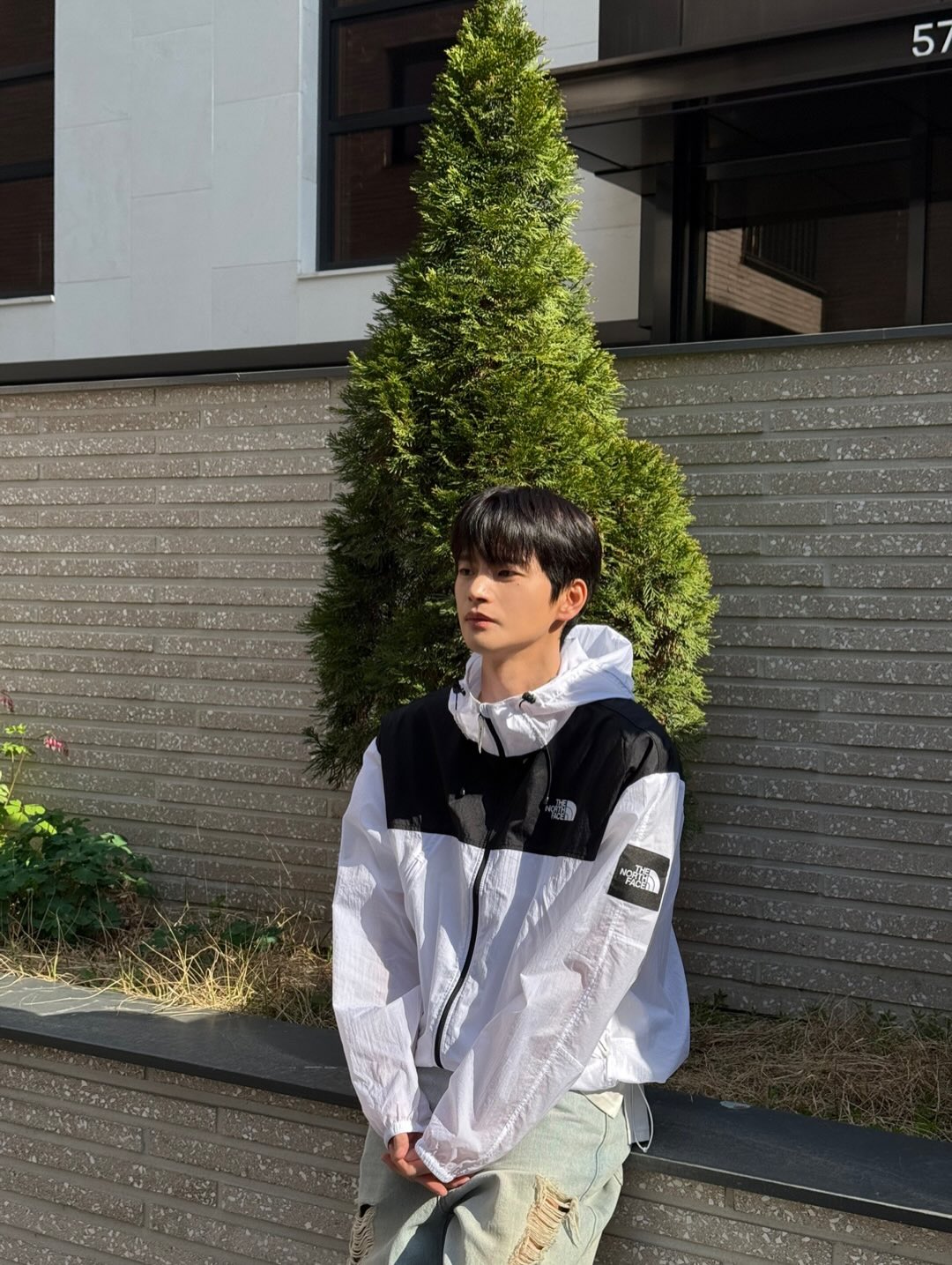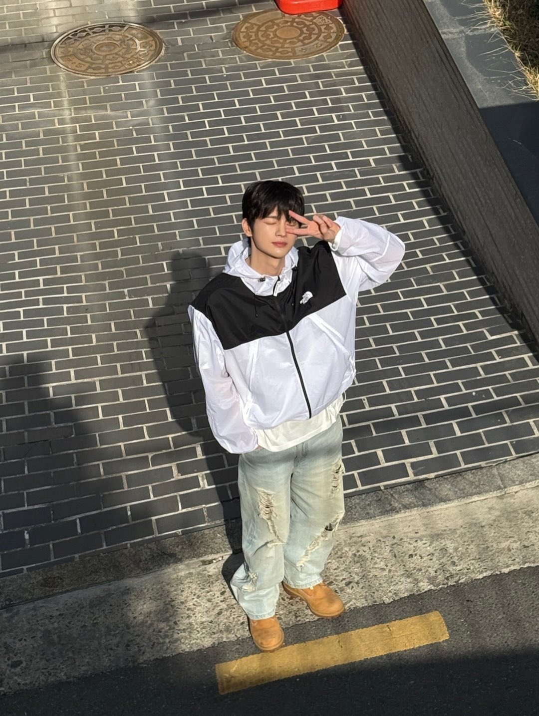 写真のソ・イングクはファッション広告の撮影に集中している。白いウインドブレーカーにジーンズというコーディネートで、カジュアルだがすっきりとした印象だ。